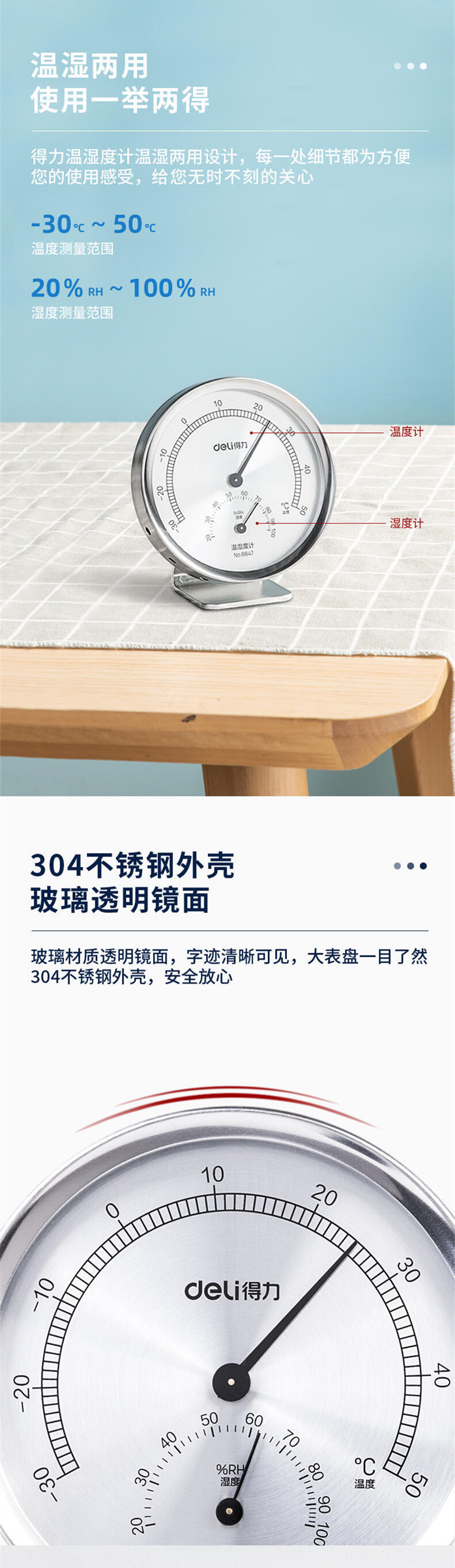 델리 8847 금속 온도 및 습도 측정기 홈 오피스 내외부 이중 목적 베이비룸용 고정밀 습식온도계스토어 가기