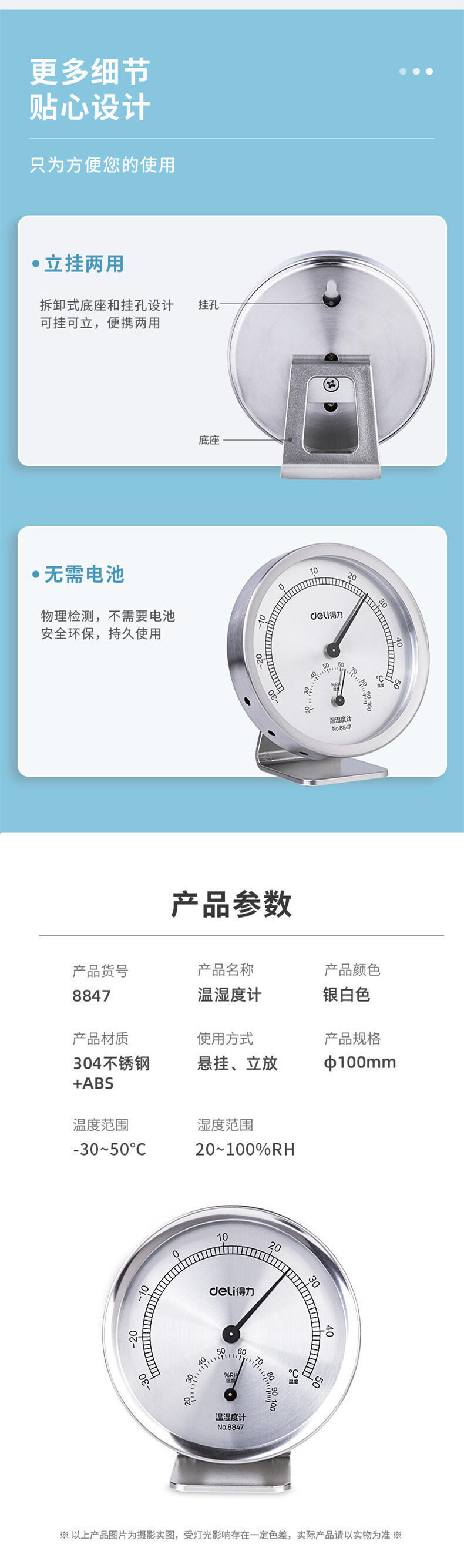 델리 8847 금속 온도 및 습도 측정기 홈 오피스 내외부 이중 목적 베이비룸용 고정밀 습식온도계