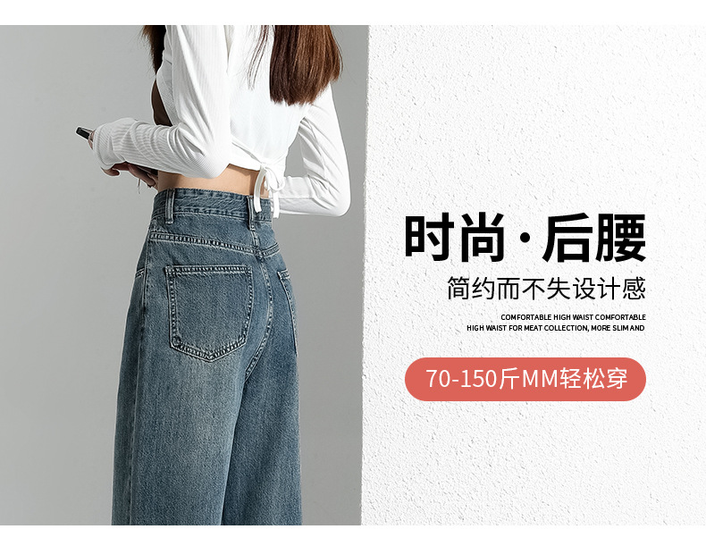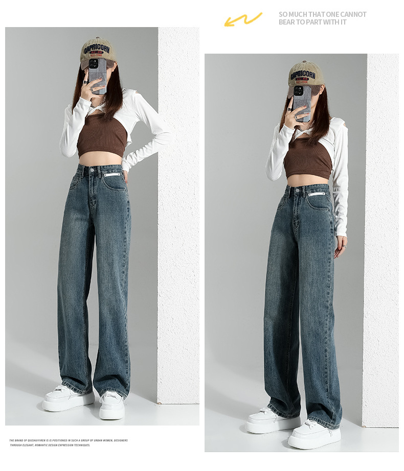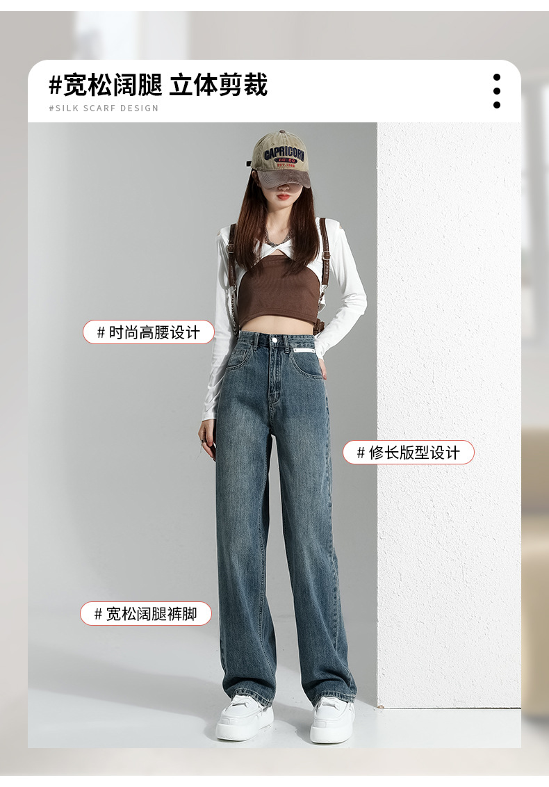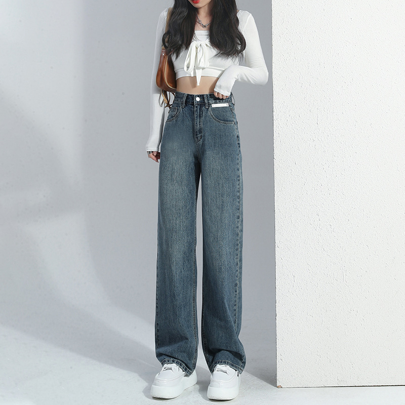 하이 웨이스트 데님 와이드 레그 팬츠 여성의 가을과 겨울 디자인 감각 작은 가죽 라벨 패션 복고풍 배 모양의 스트레이트 팬츠스토어 가기