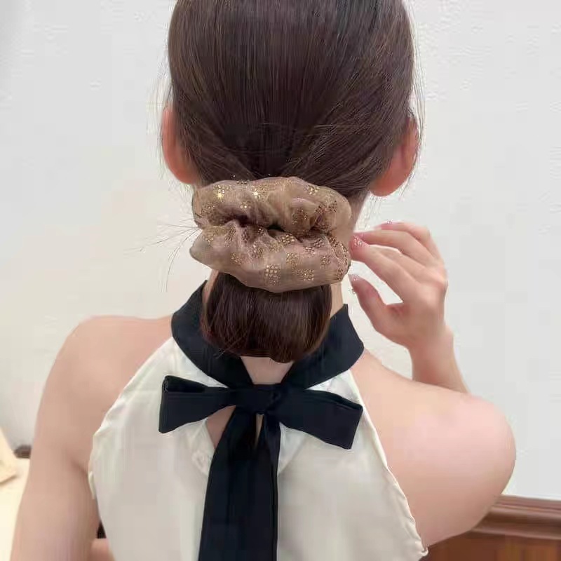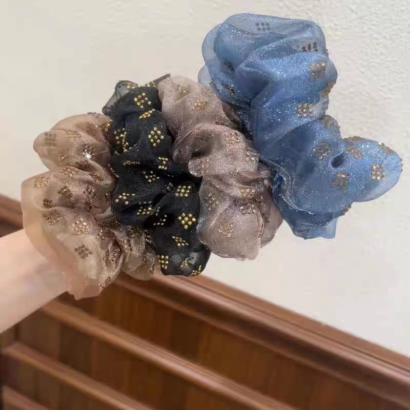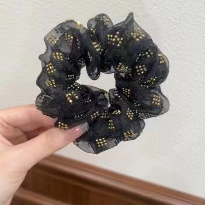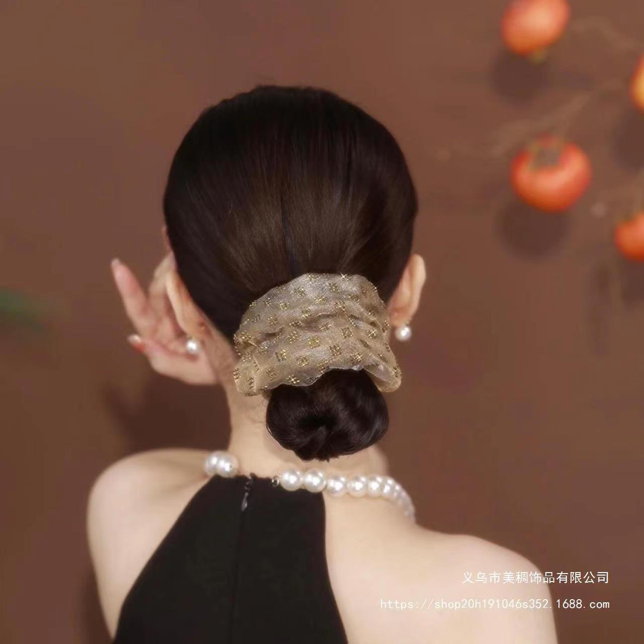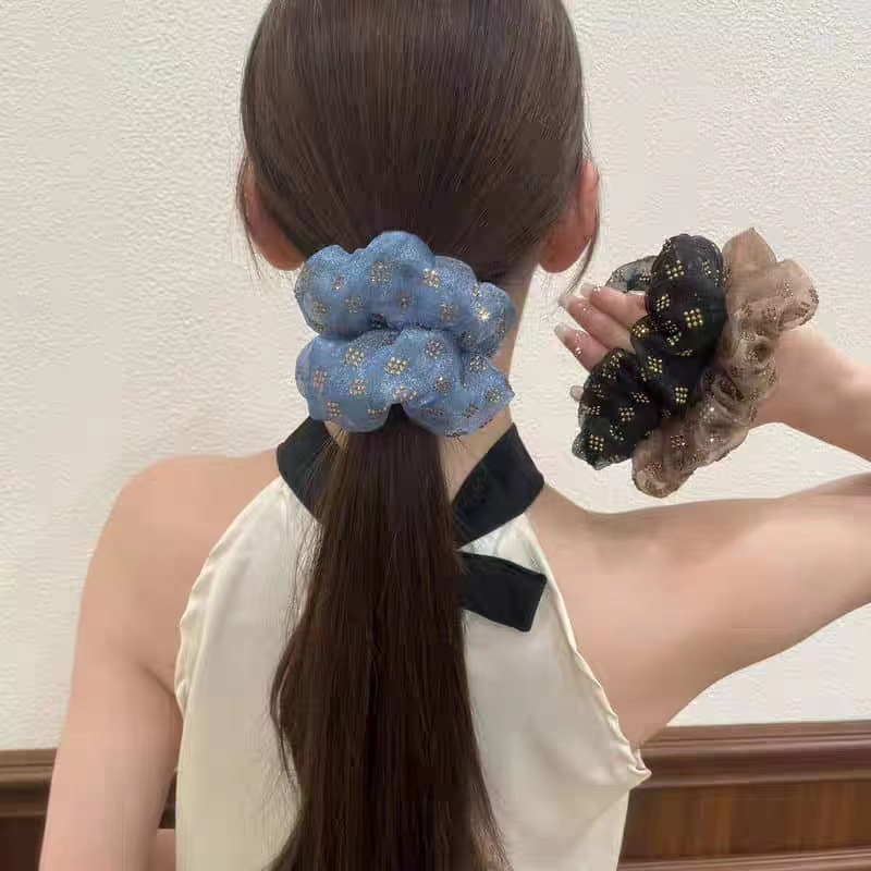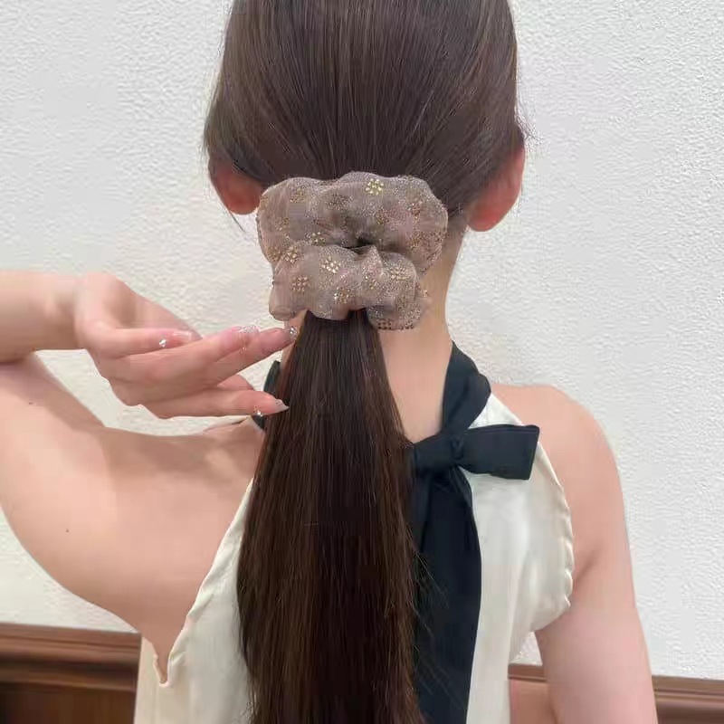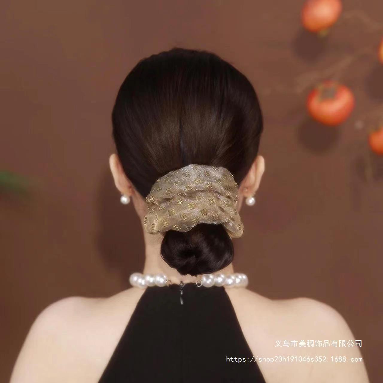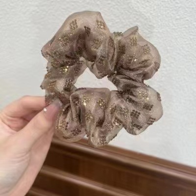 고급 레트로 격자 무늬 대형 창자 반지 유행 절묘한 더블 레이어 Organza 헤어 로프 여성을위한 전체 다이아몬드 주름 헤어 액세서리스토어 가기