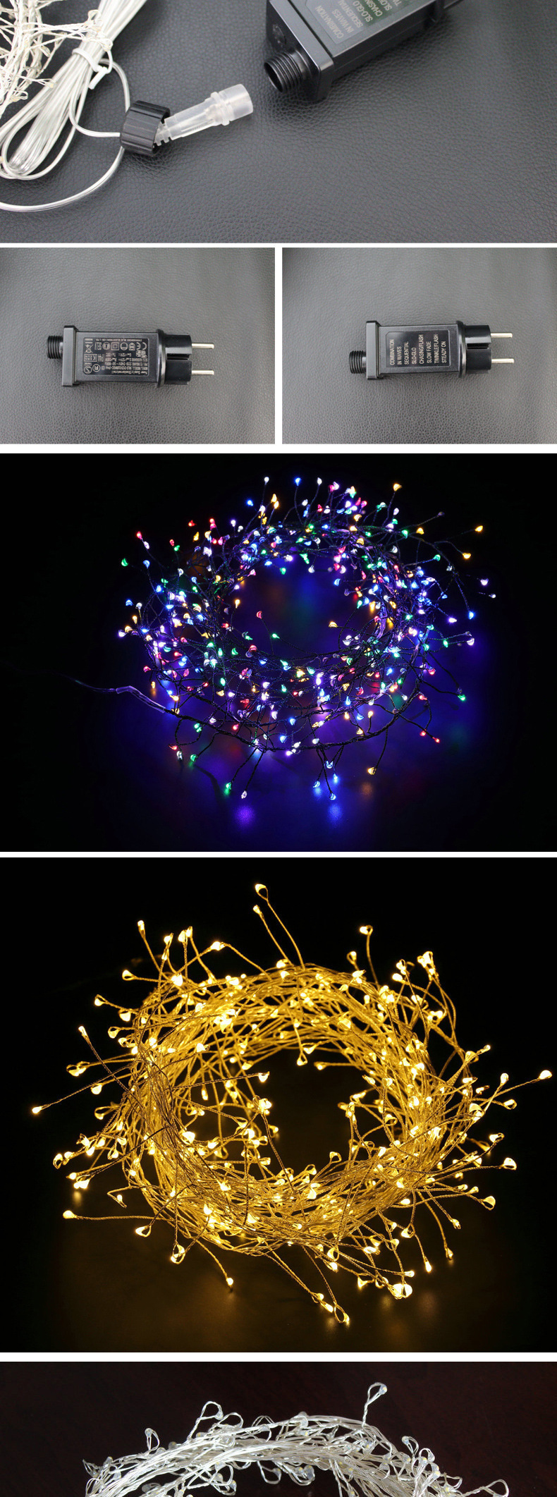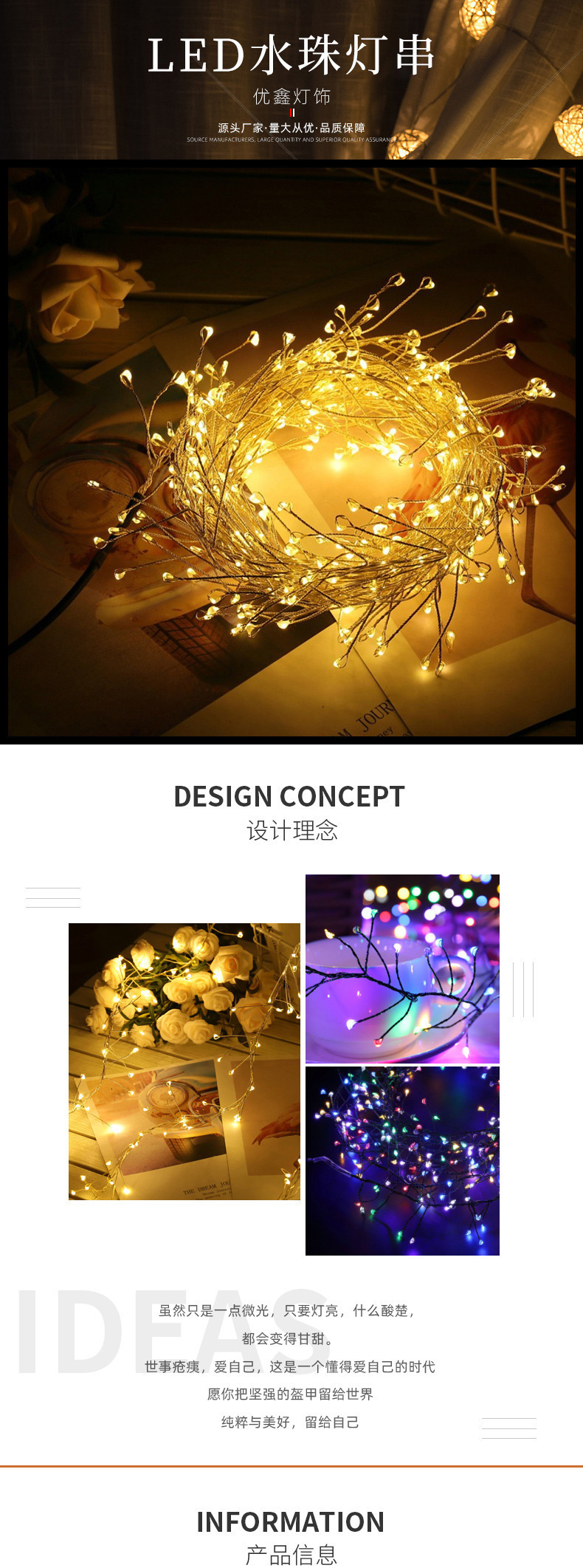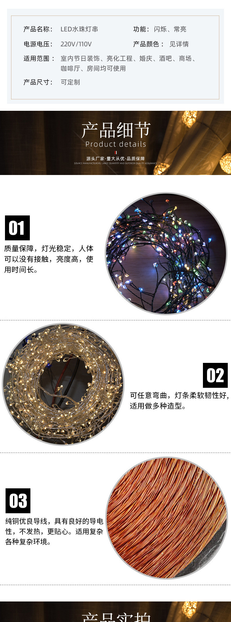 产品规格:黑线/银线 3米100灯/ 6米200灯,其他规格可定制