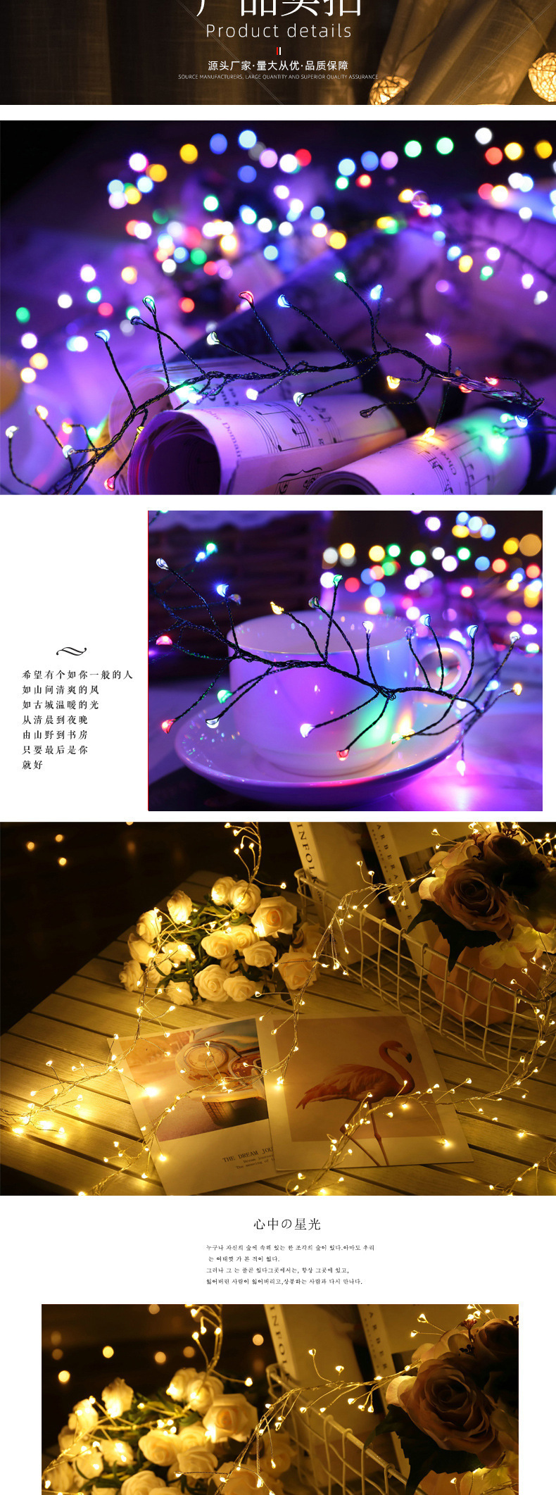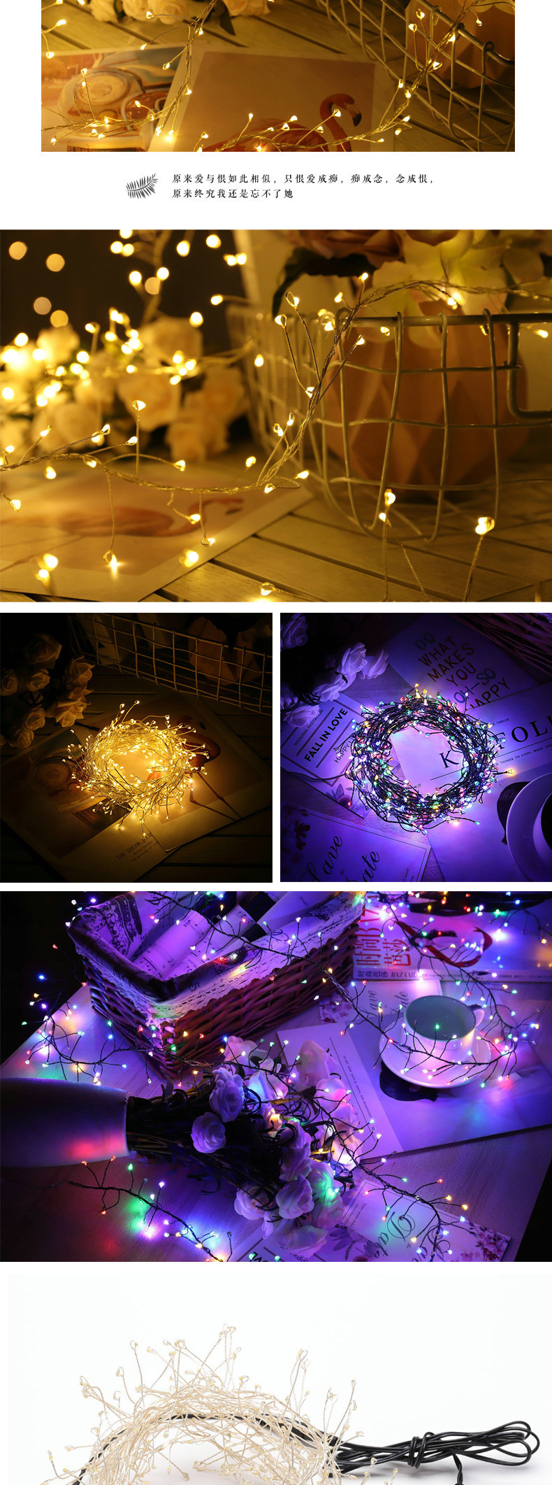 2.LED铜线灯低功耗、能、寿命长、冷光源、可长时间点亮,颜色丰富,可编织成各式各样灯串及艺术品。