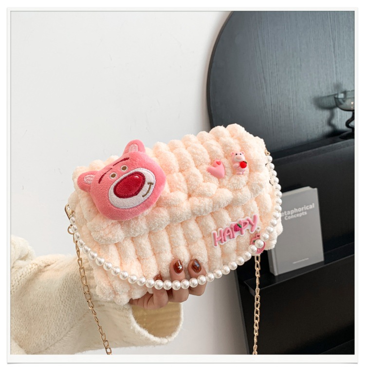 • 밀크 살구색 (딸기 곰) + 진주 핸드헬드 + 체인 숄더 스트랩 (재료 패키지 + 튜토리얼)