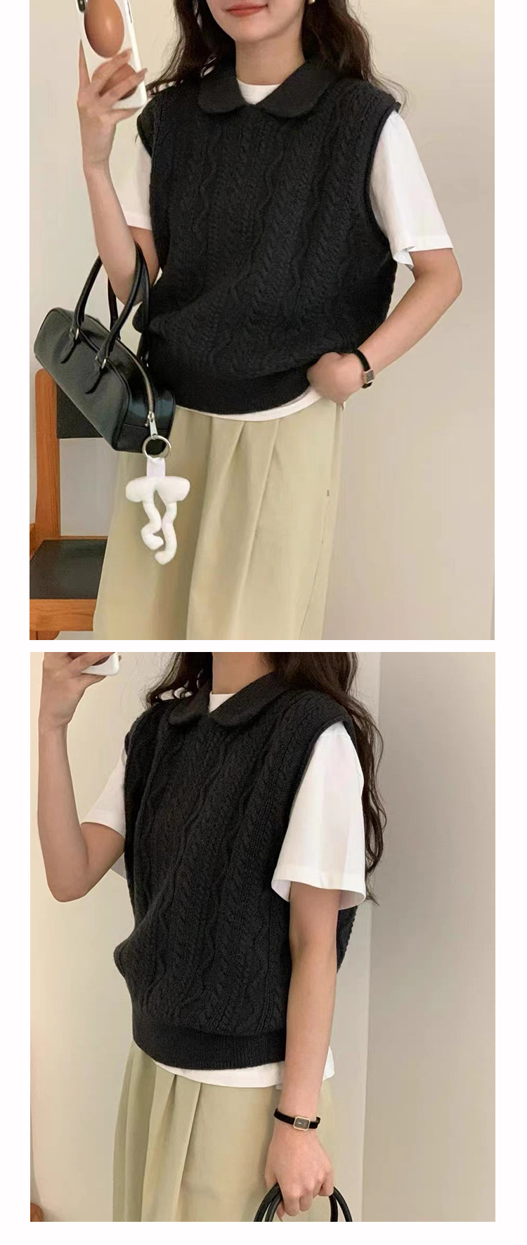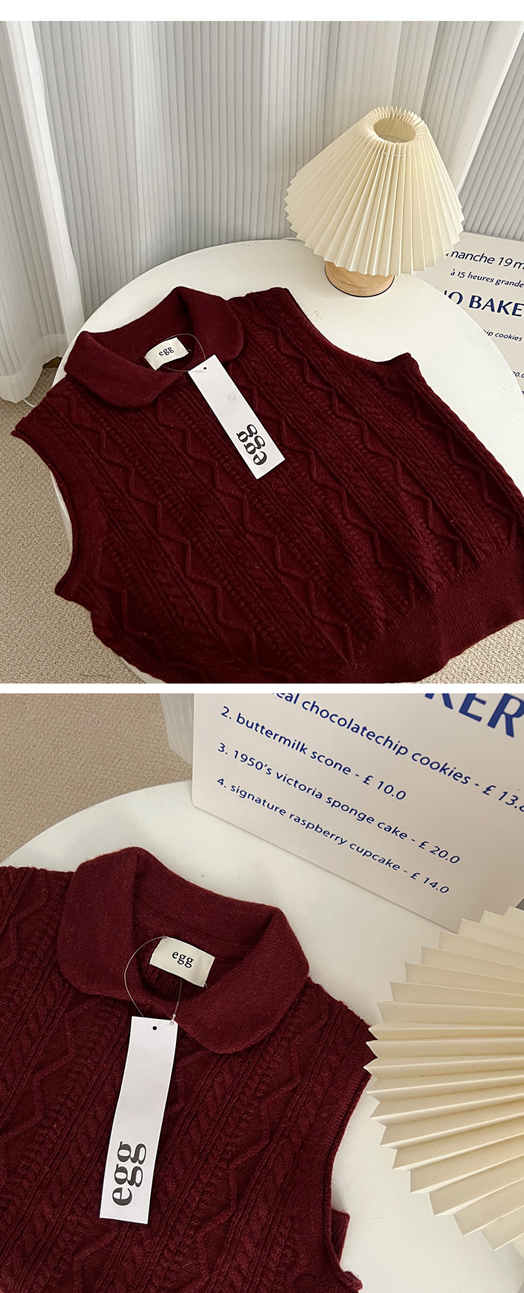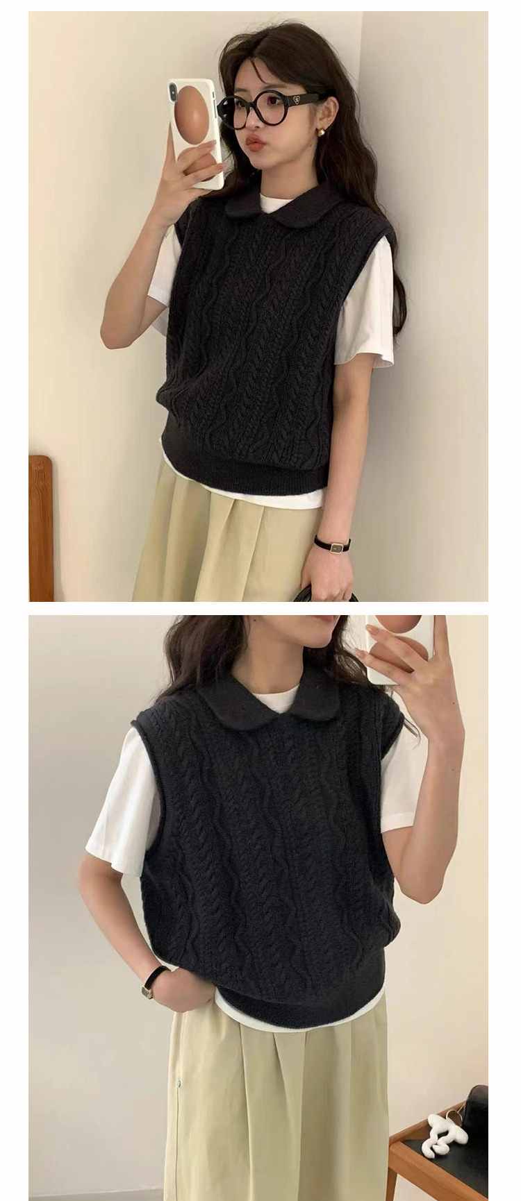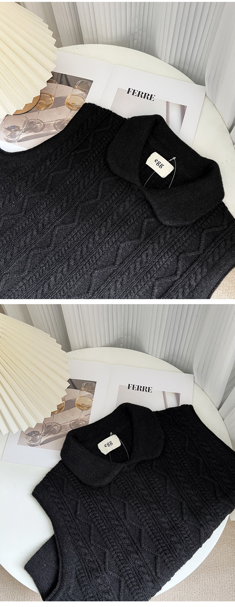 한국 동대문 에그홈 젊어보이는 레이스 칼라 트위스트 니트 루즈핏 조끼 봄가을 여성용 이너웨어스토어 가기