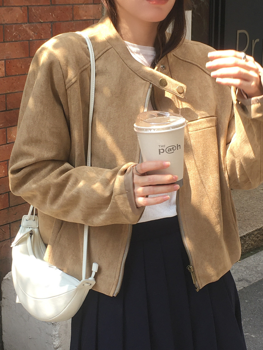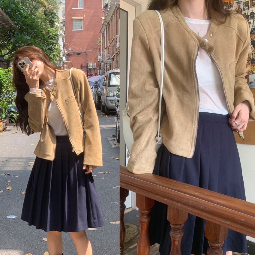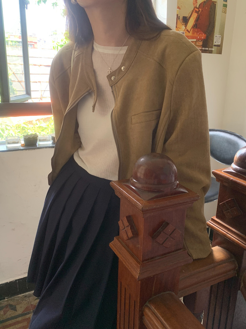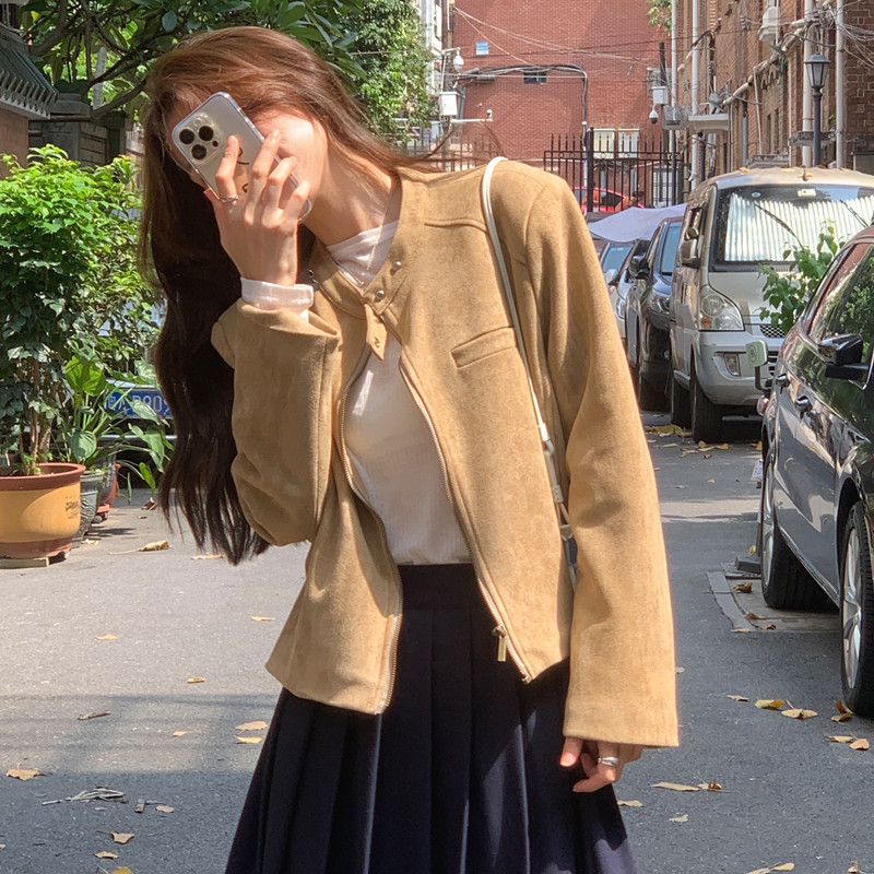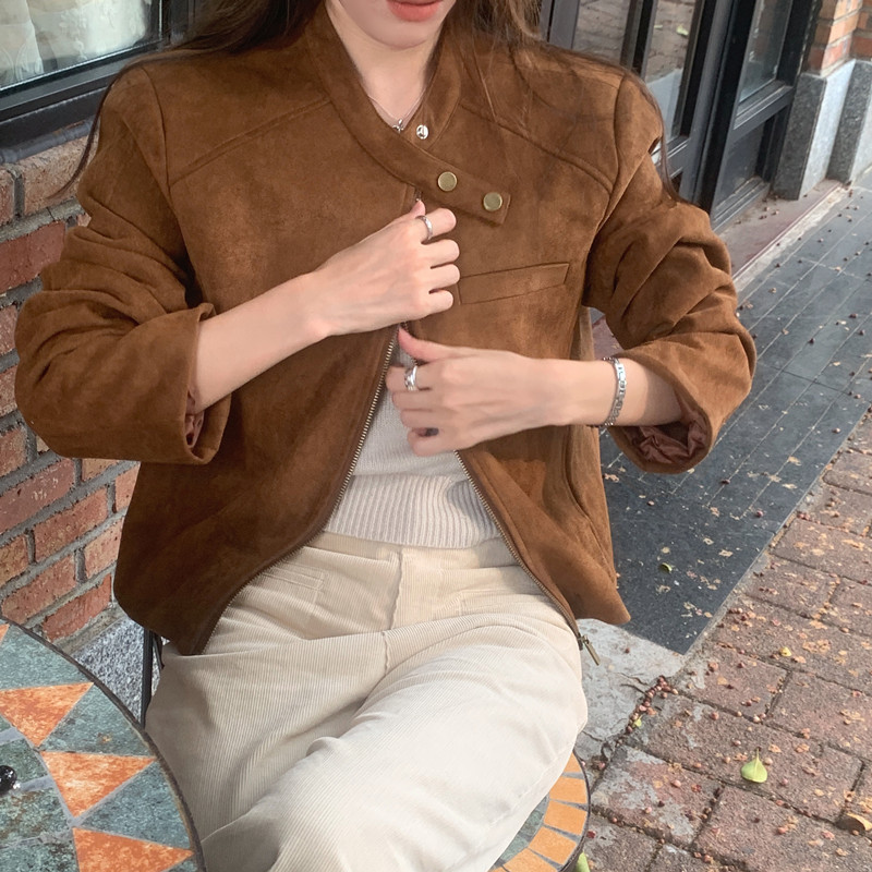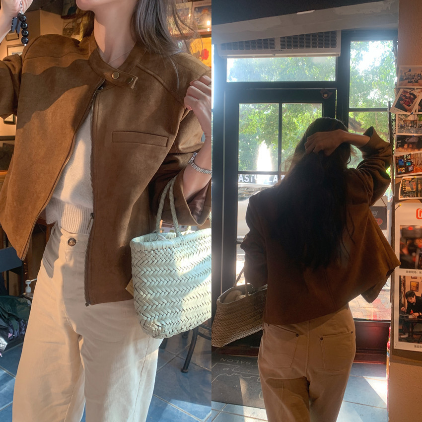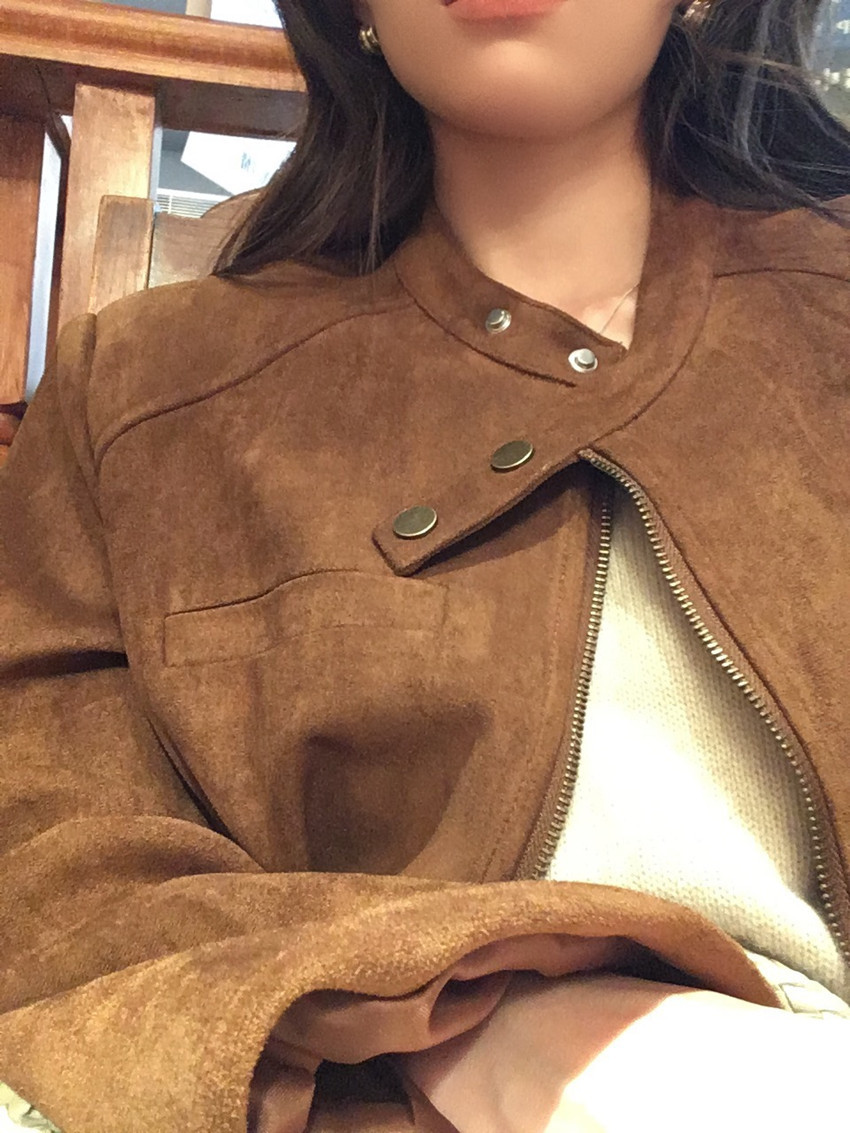 미국 복고풍 자전거 의류 사슴 가죽 벨벳 지퍼 스탠드 칼라 재킷 여성의 가을과 겨울 쿨 풀 짧은 재킷 탑 2 컬러스토어 가기