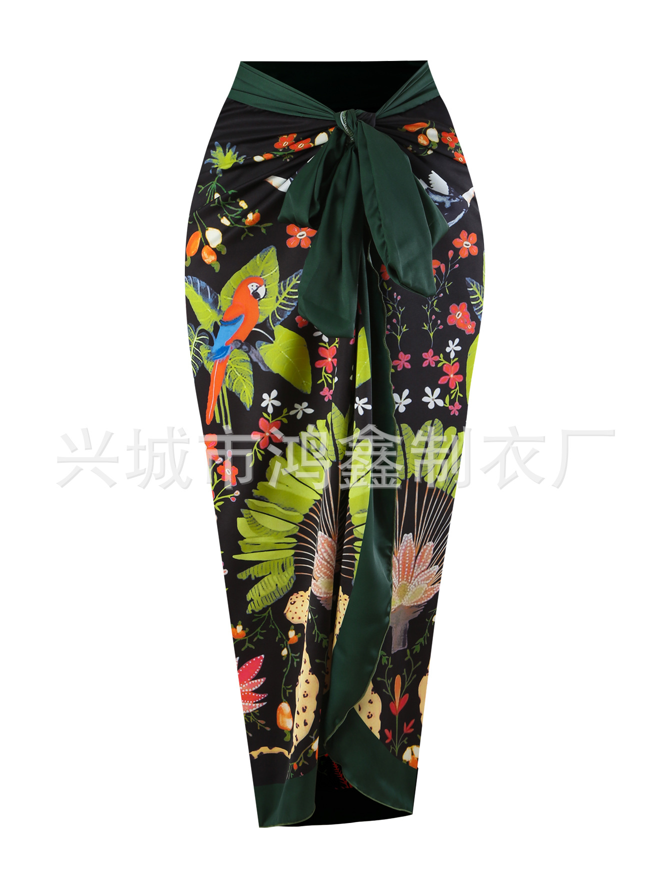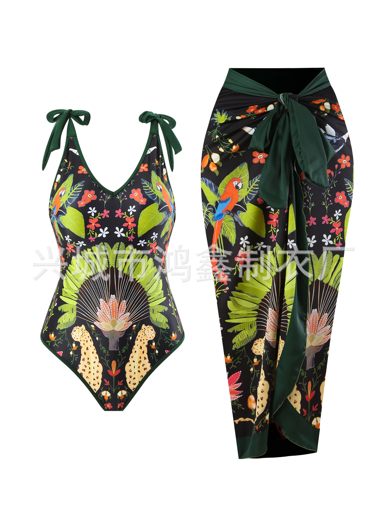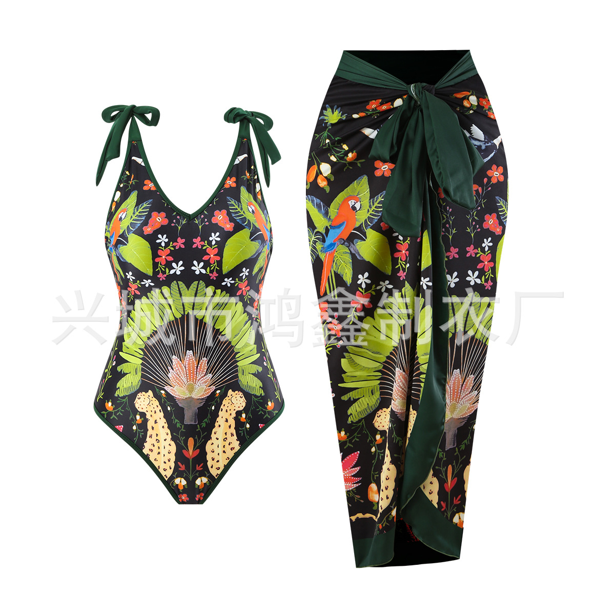 Longqi 2024 유럽과 미국 대외 무역 새로운 비키니 투피스 백 힙 거즈 스커트 여성 수영복 레트로 프린트 수영복