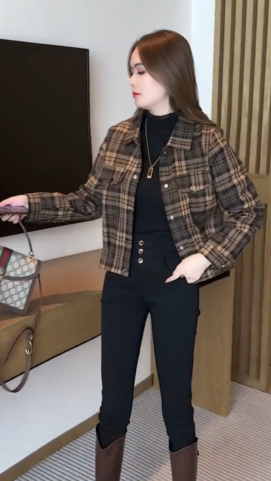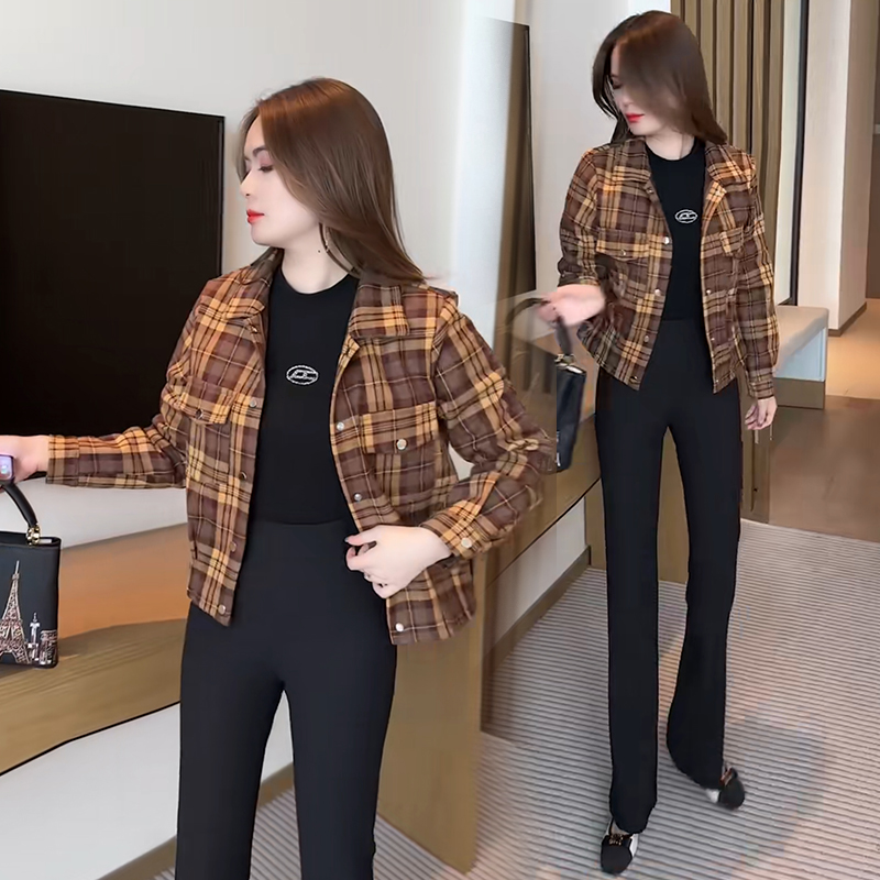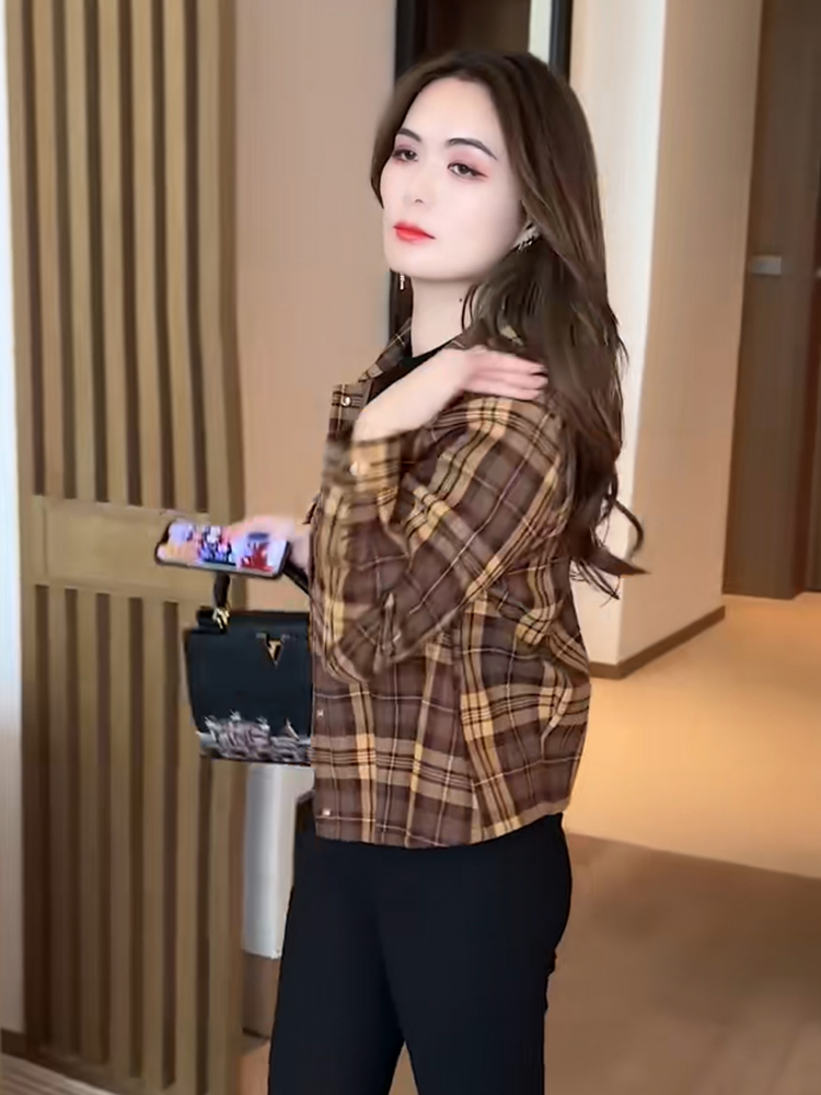 2023 여성 연령 감소 스몰 캐주얼 슬림 핏 격자 무늬 기모 짧은 코트를 위한 새로운 Maillard 탑