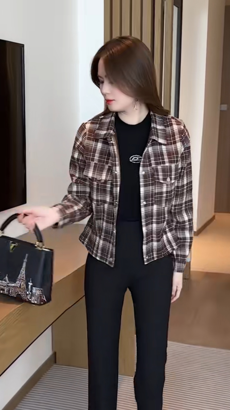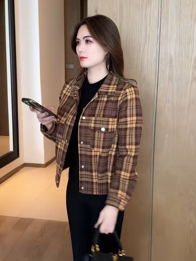 2023 여성 연령 감소 스몰 캐주얼 슬림 핏 격자 무늬 기모 짧은 코트를 위한 새로운 Maillard 탑스토어 가기