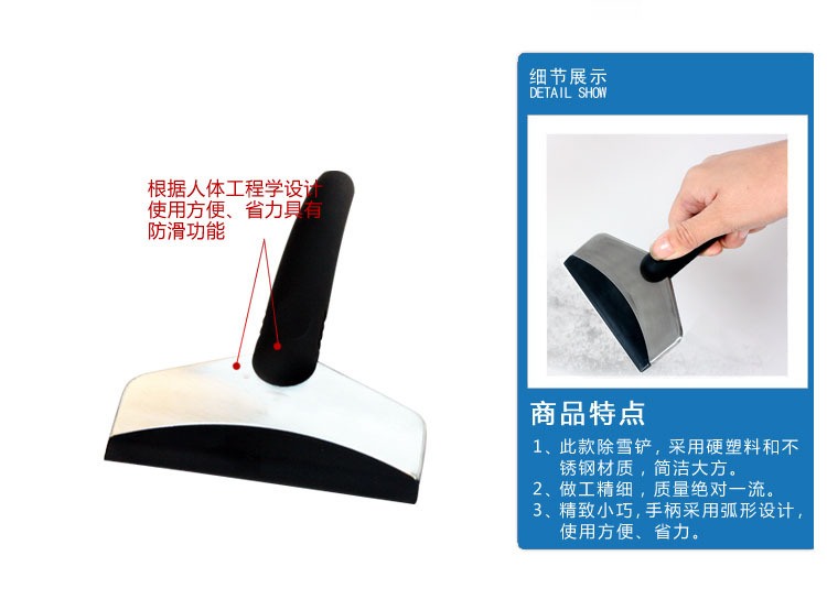1、此款除雪铲,采用硬塑料和不锈钢材质,简洁大方。