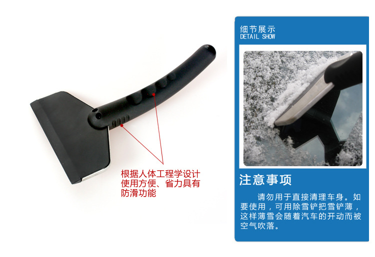 特别注意:请勿用于直接清理车身。如要使用,可用除雪铲把雪铲薄,这样薄雪会随着汽车的开动而被风吹落!