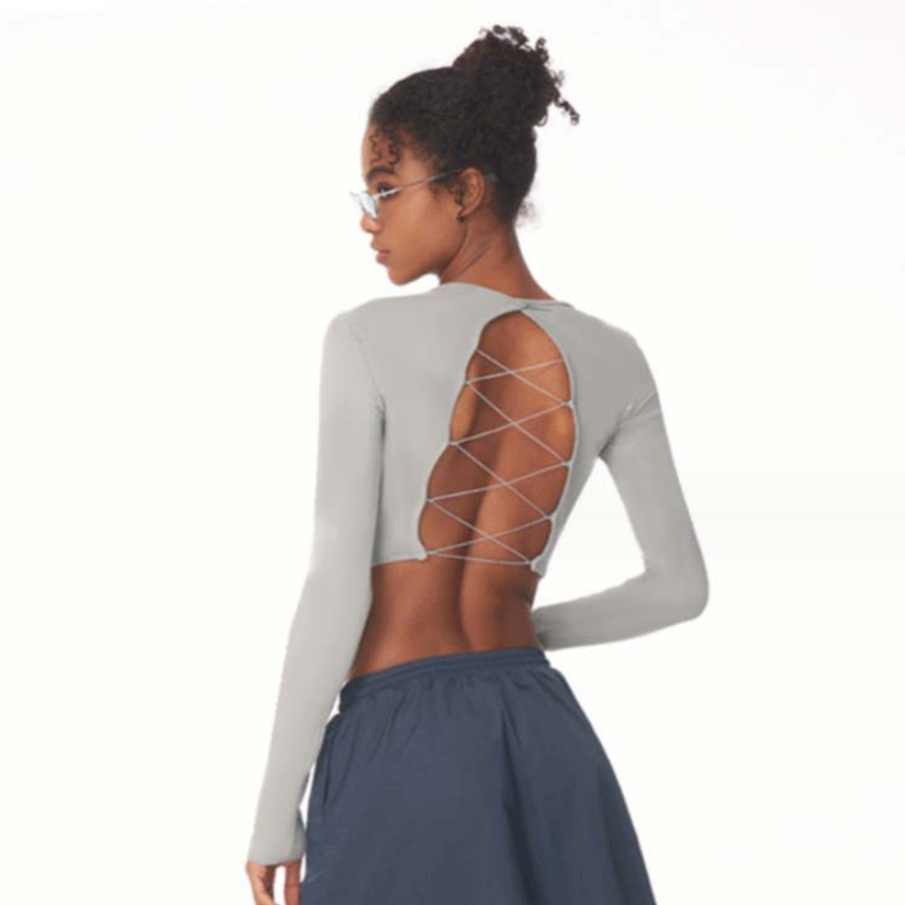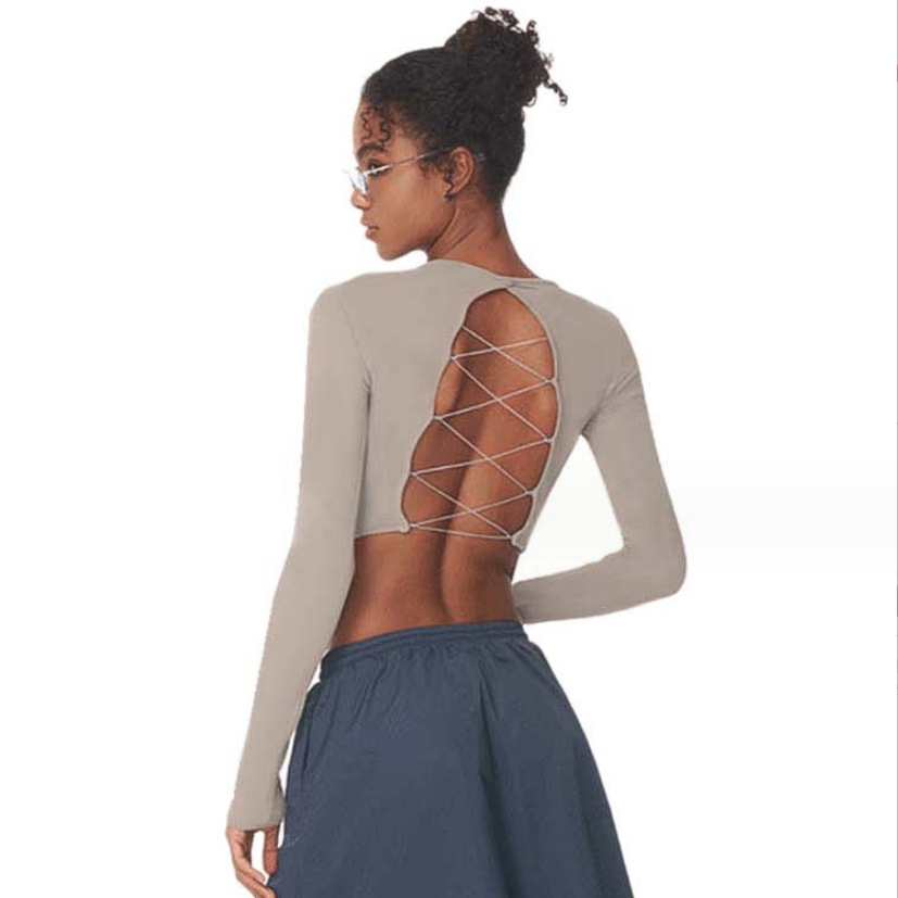 여성을위한 짧은 긴 소매 요가 세트 훈련 섹시한 뒤 리본 야외 피트니스 댄스 겉옷 신제품스토어 가기