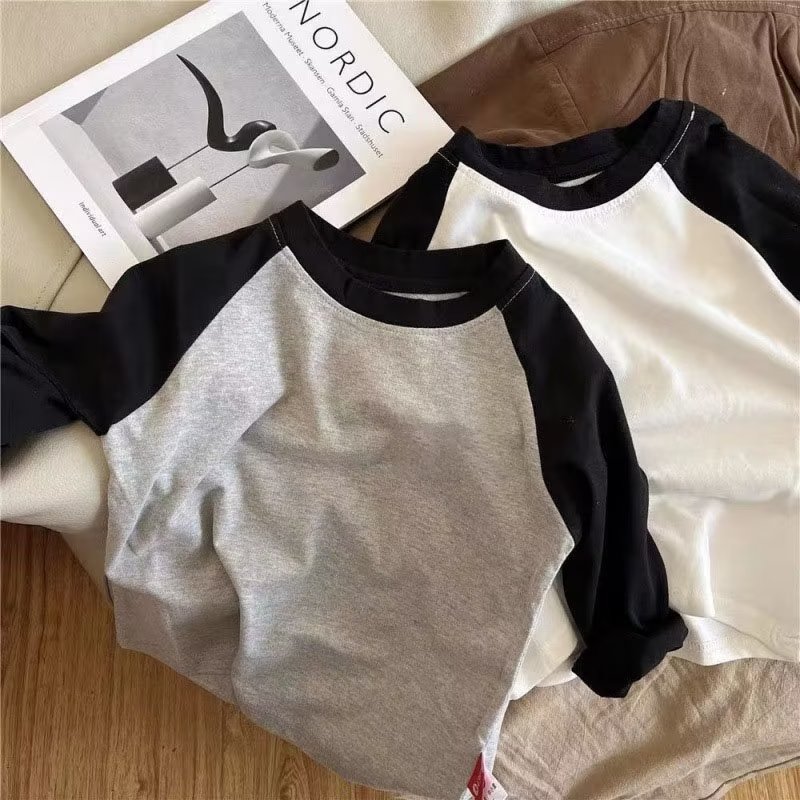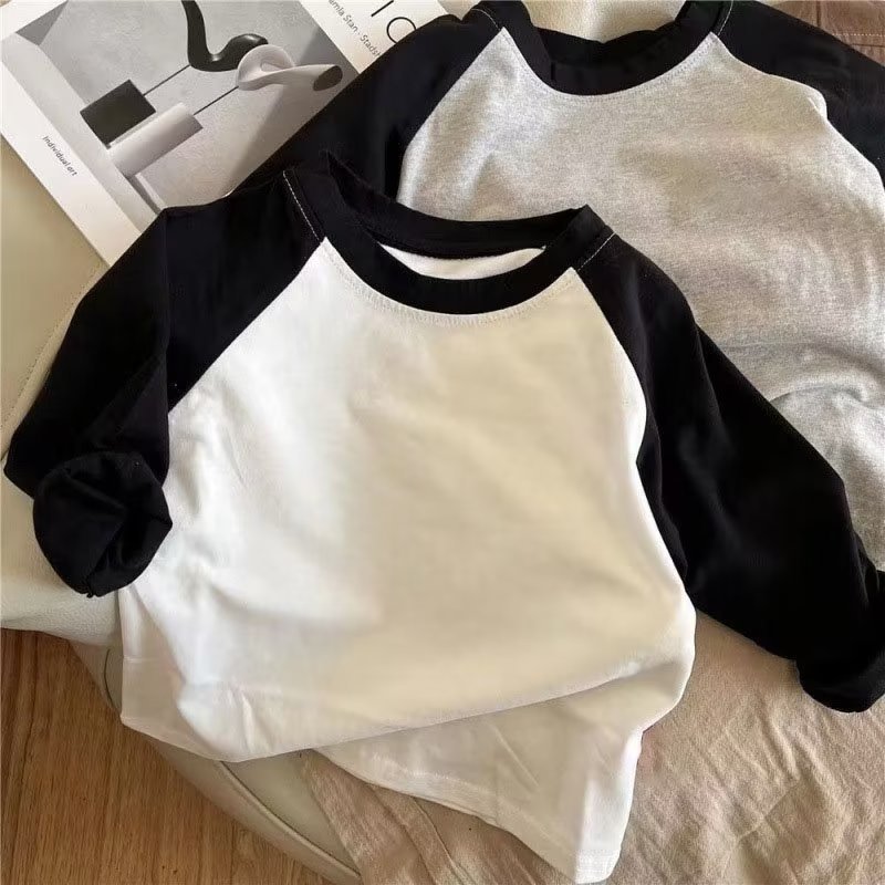 봄과 가을 스티칭 검은 소매 어린이 티셔츠 남성용 유행 라운드 넥 베이스 티셔츠 여아 심플 이너 탑스토어 가기