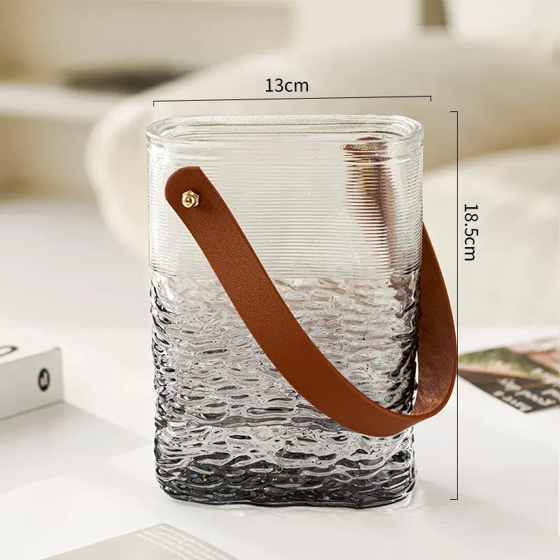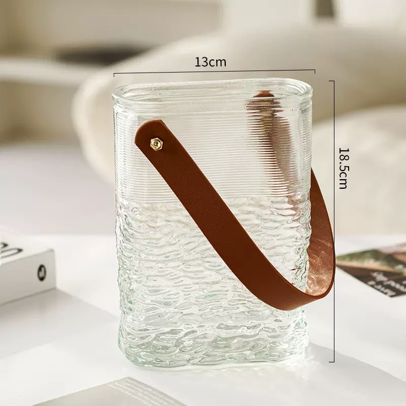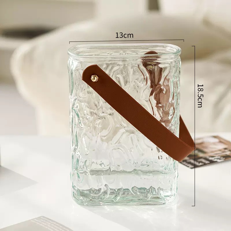 간단한 가벼운 고급 가죽 핸드 헬드 유리 꽃병 투명 수경 장미 백합 꽃 홈 식탁 장식 장식품