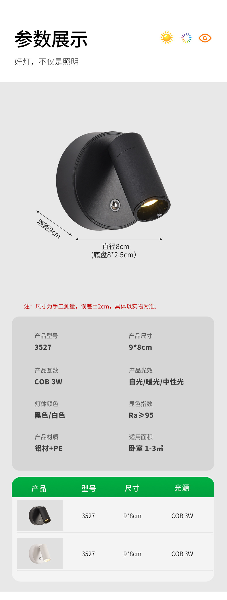 • 3527-B 모델 흰색 9cm-단색 따뜻한 빛 3W-전체 스펙트럼