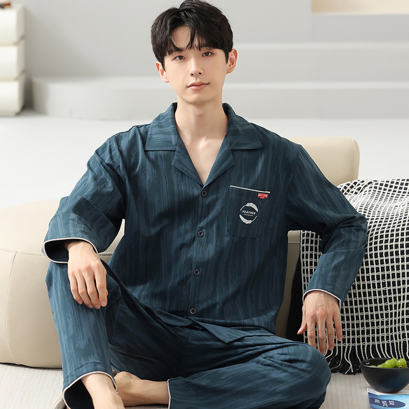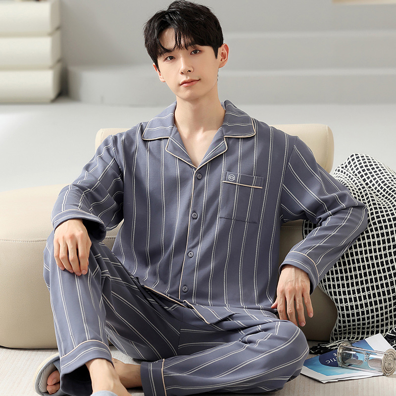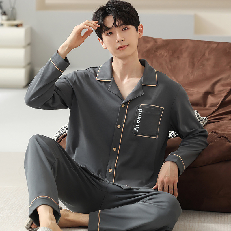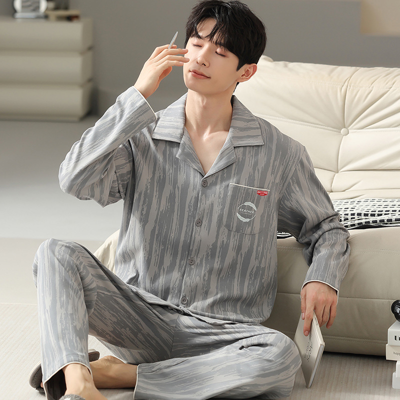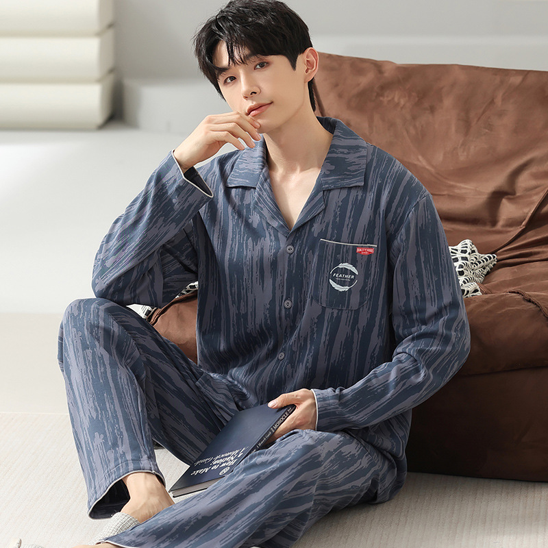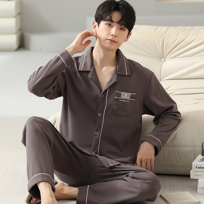 [순면] 가디건 라펠 남성 잠옷 가을과 겨울 새로운 플러스 사이즈 가정 옷 긴 소매 바지 겉옷 세트