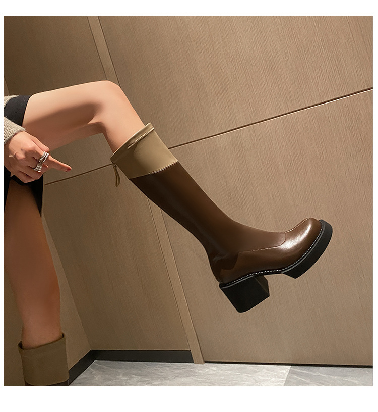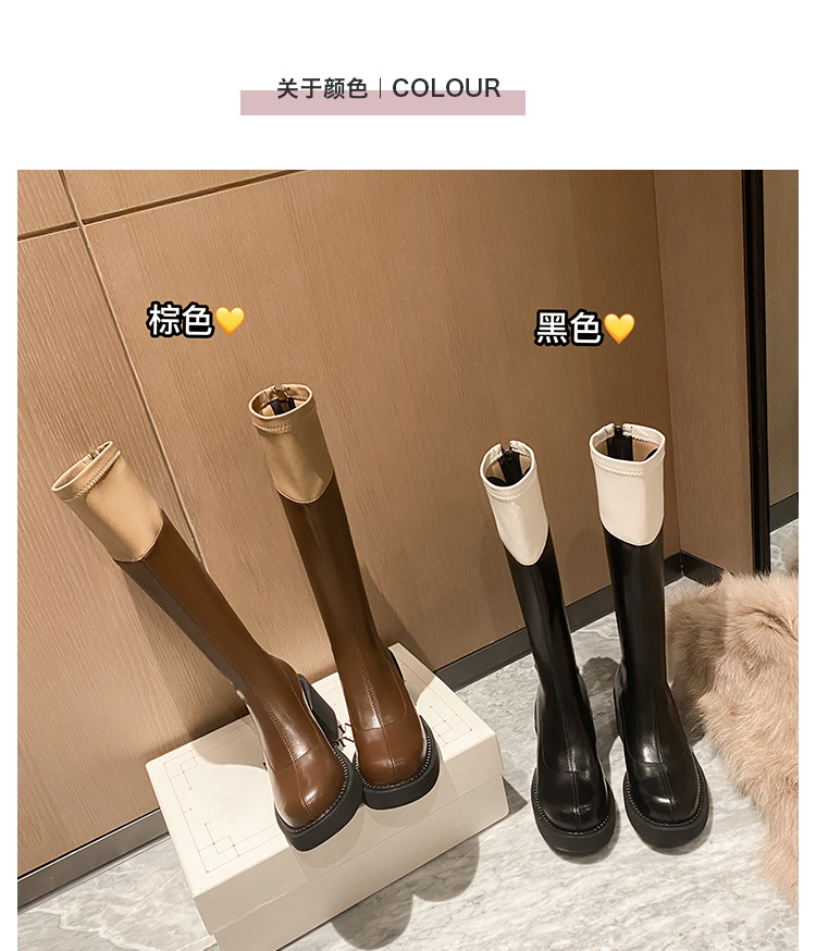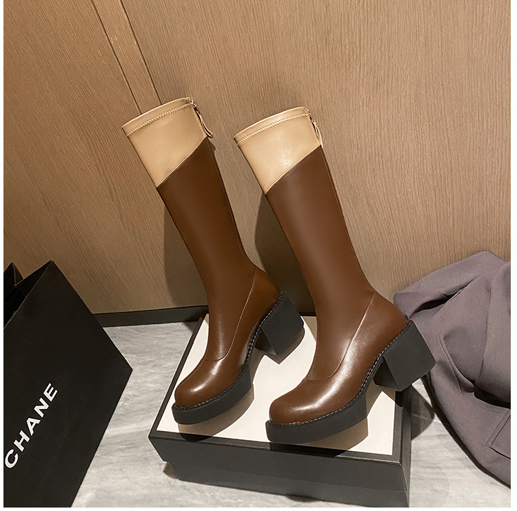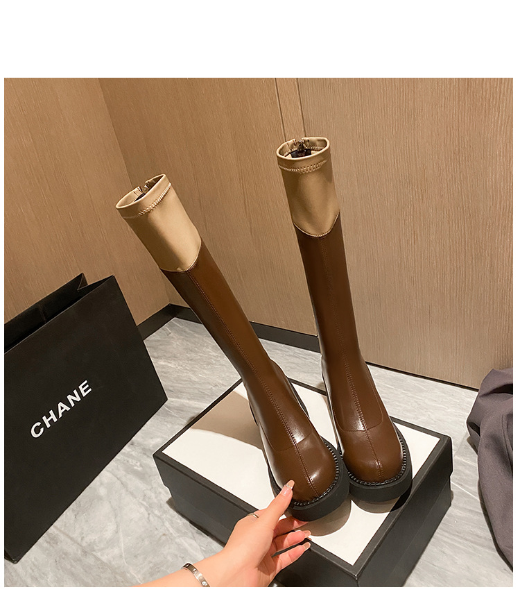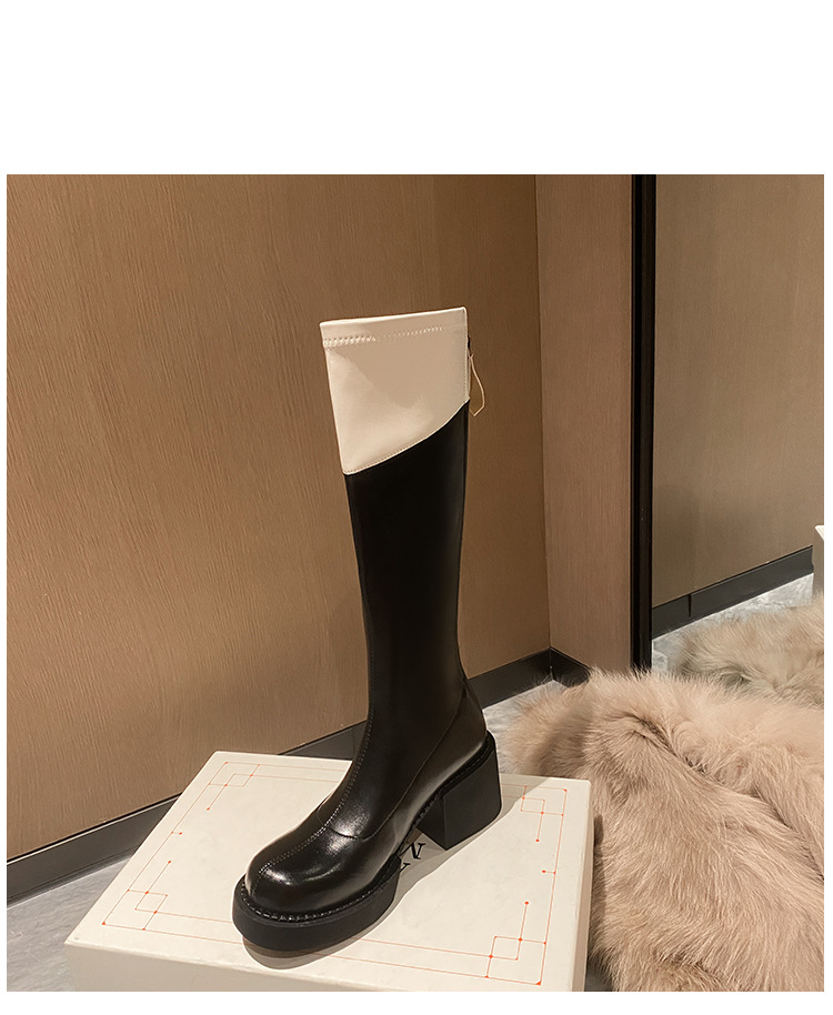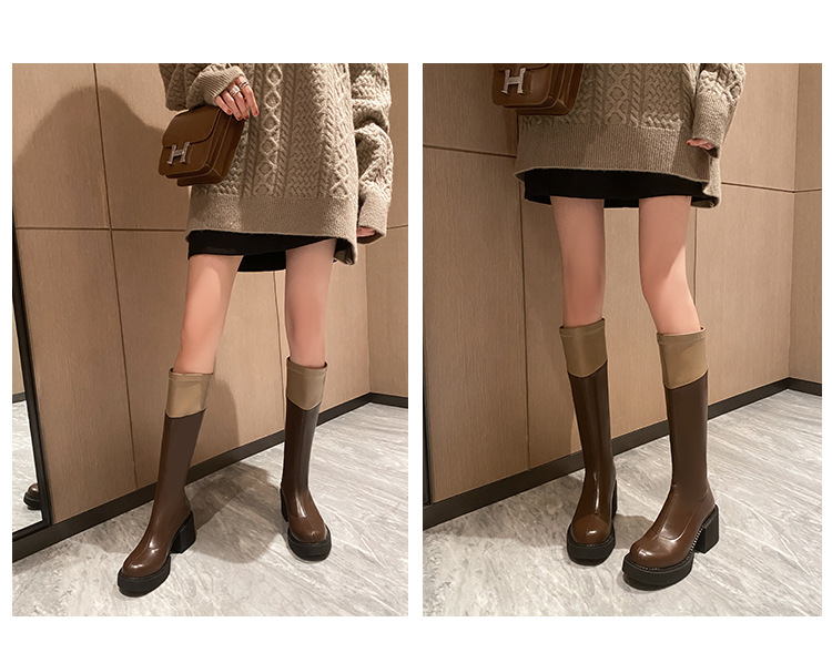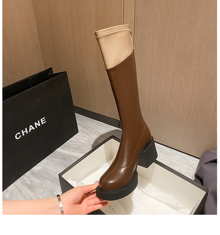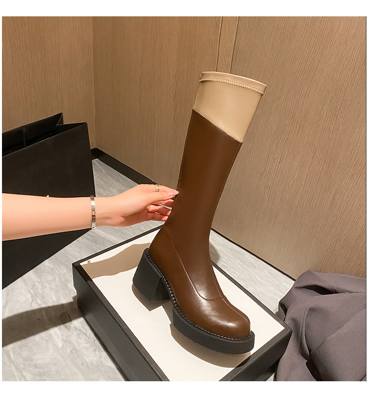Qiu Meier 컬러 매칭 ~ 슬림 슈즈 여성용 두꺼운 굽 두꺼운 바닥 탄성 Maillard 높은 부츠 두꺼운 다리 큰 튜브 긴 튜브스토어 가기