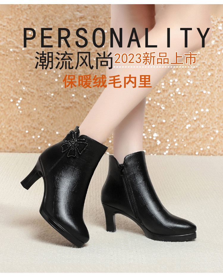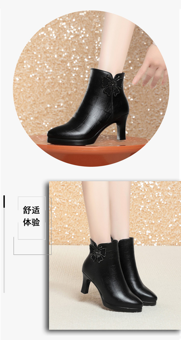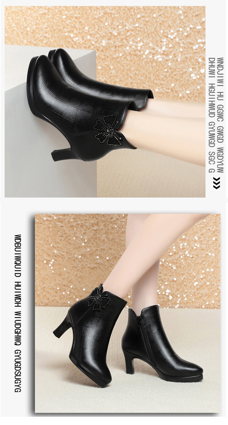 새로운 가을과 겨울 2023 여성을위한 하이힐 짧은 부츠 스커트 부츠 뾰족한 발가락 뒤꿈치 여성용 부츠 어머니 기모 가죽 신발