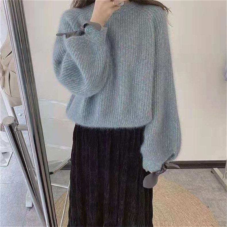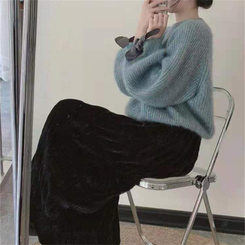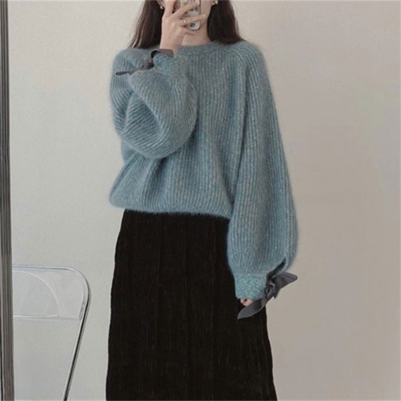 2025 가을 겨울 신상 스웨터 여성 한국 스타일 패션 레이지 스타일 리본 랜턴 소매 모조 밍크 니트웨어스토어 가기