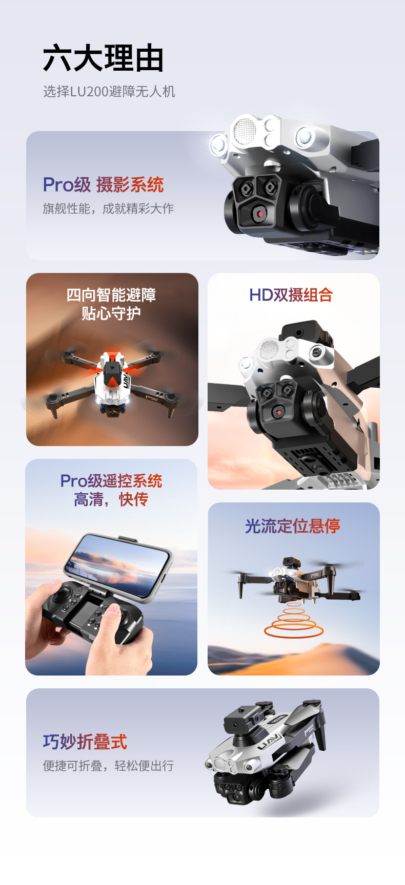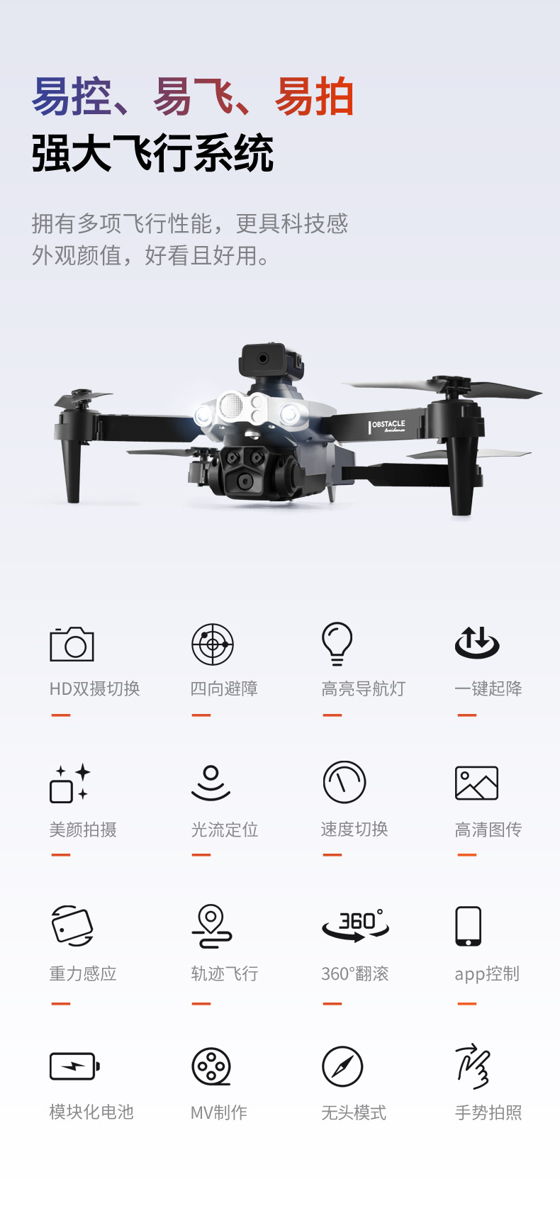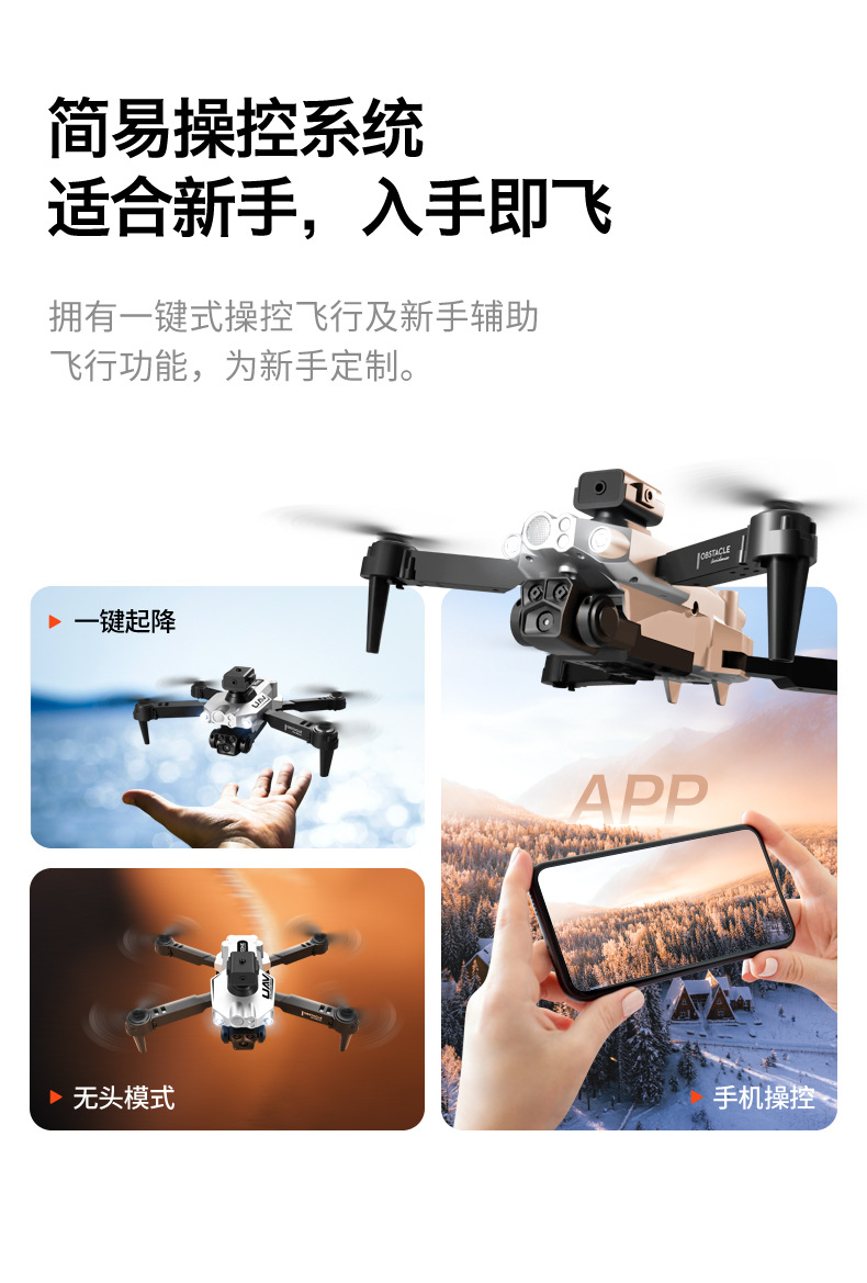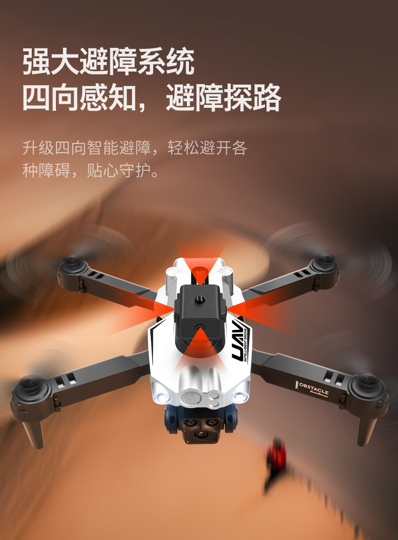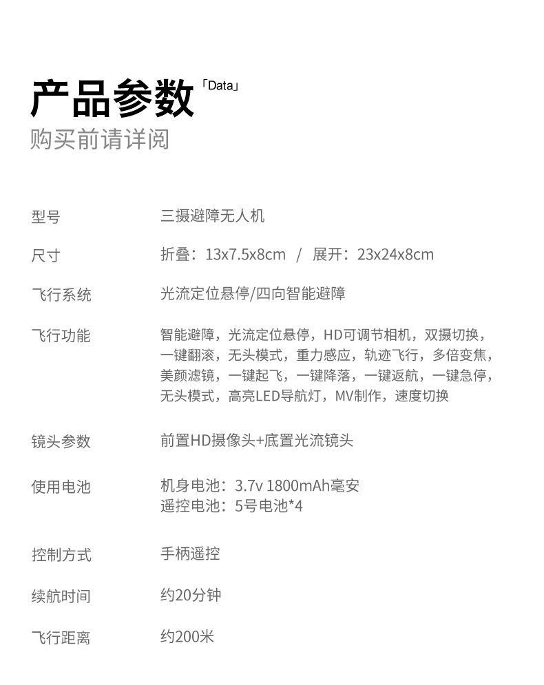 基本功能:四面避障,光流定高功能,飞机可折叠,六通陀螺仪,一键起飞,一键降落,前进后退,左右侧飞,转向,无头模式,360°翻滚(带摄镜头可加功能:APP操控,360°翻滚,手势拍照,录像,无头模式,急停,轨迹飞行,重力感应,自动拍照)