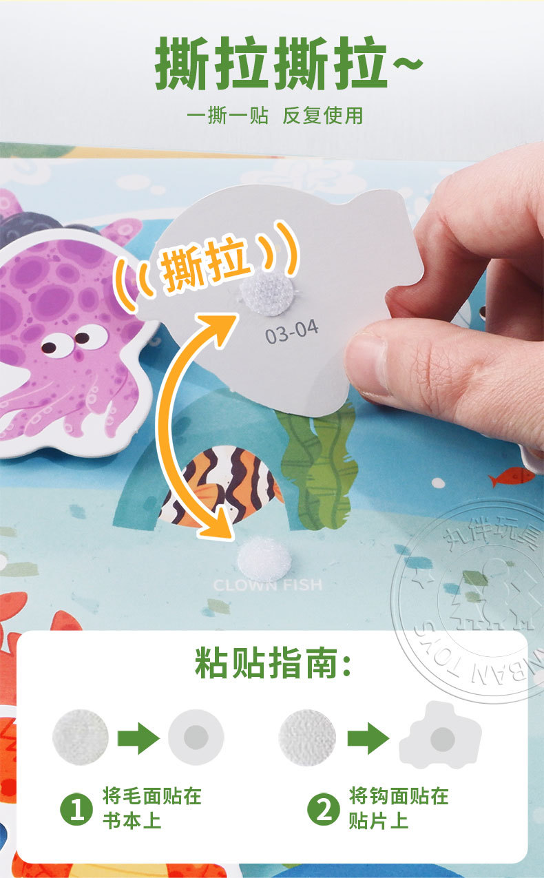 温馨提醒:魔术贴白色毛面是贴书本上的,透明面勾面是贴贴纸上的,不要贴错哦,不然数量不够哦!
