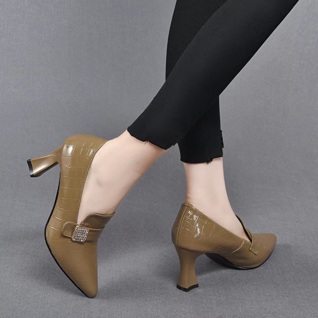 뾰족한 발가락 하이힐 여성용 2023 가을 새로운 라인 석 스퀘어 버클 딥 컷 스틸레토 힐 패션 신발 스톤 패턴 가죽 여성 신발스토어 가기