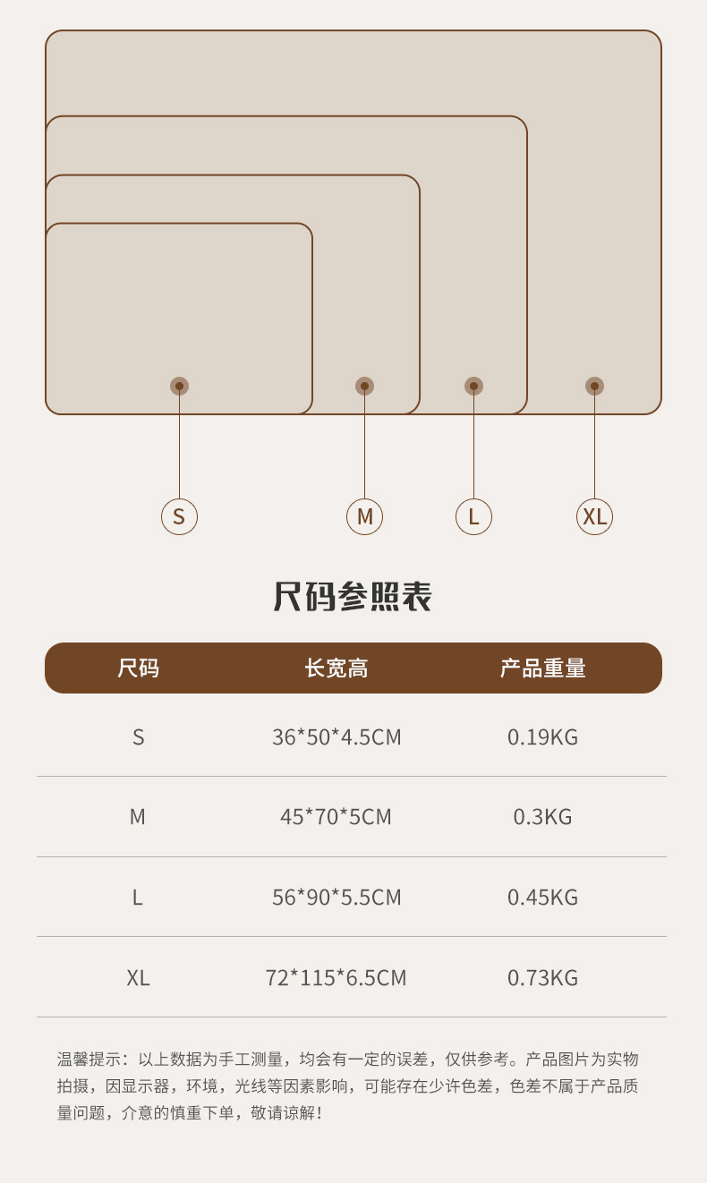 【包装尺寸】 S::25*19*3cm/0.2kg, M:27*26*3.5cm/0.32kg ,L:32*31*4cm/0.47kg,XL:41*38*4.5cm/0.78kg