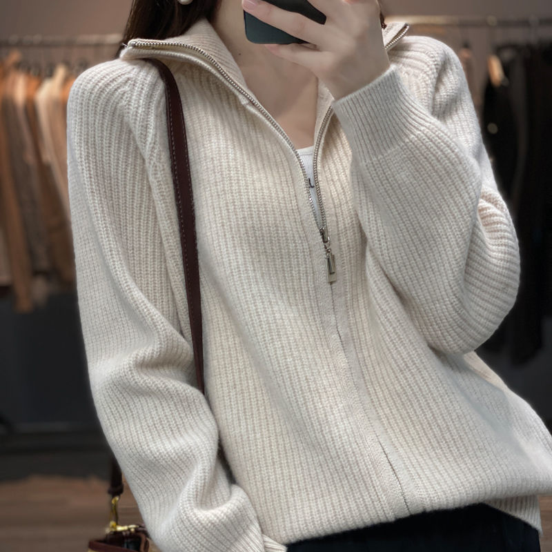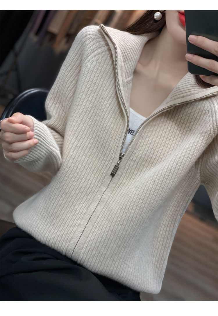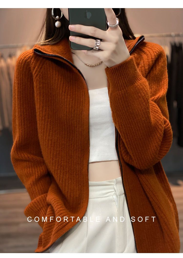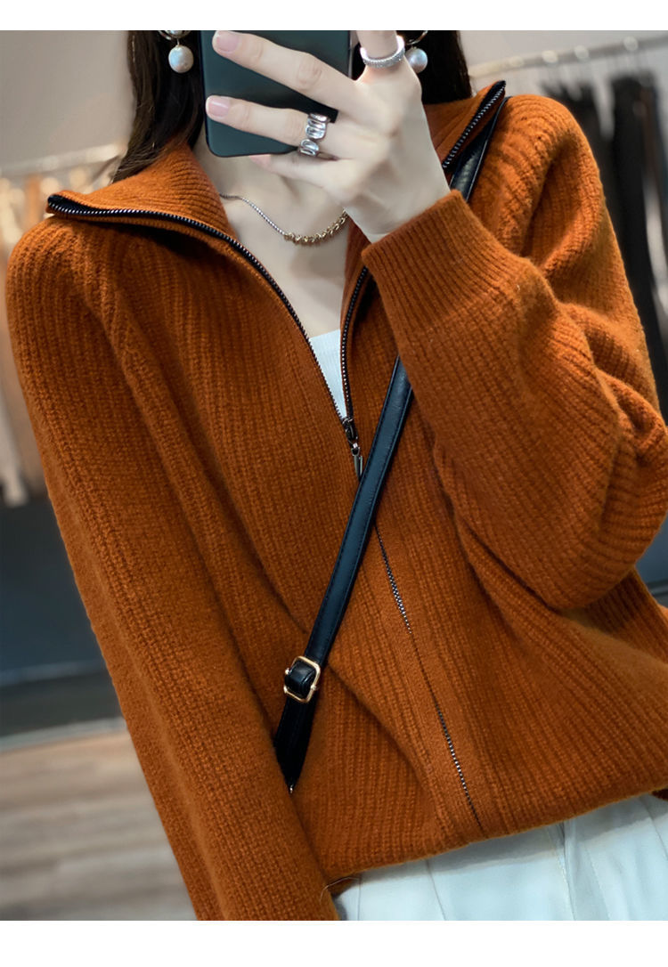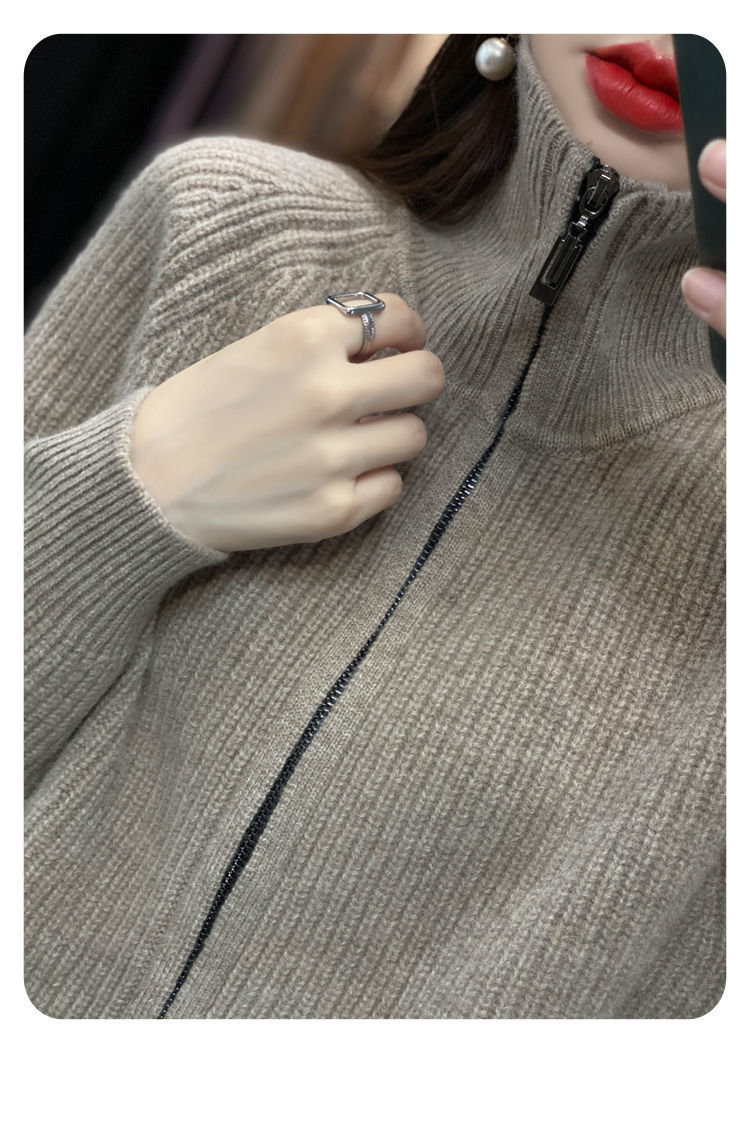 [양털] 솔리드 컬러 캐시미어 가디건 여성 루즈 스탠드 칼라 지퍼 스웨터 울 스웨터 짧은 코트 두꺼운