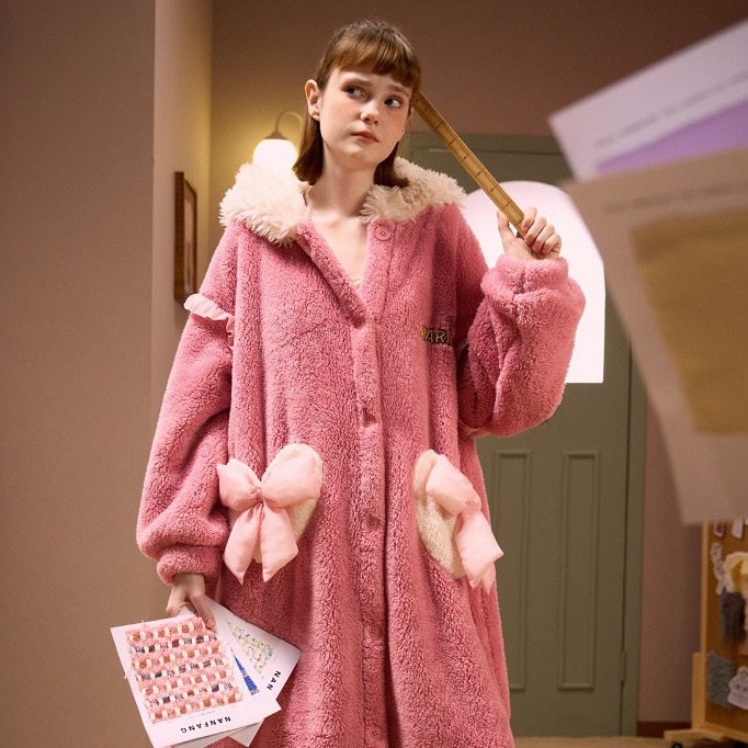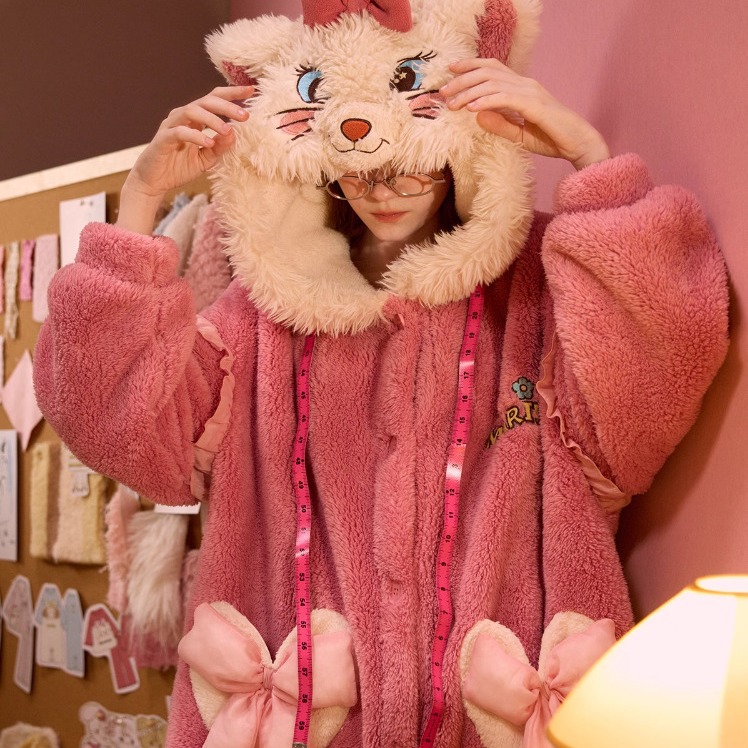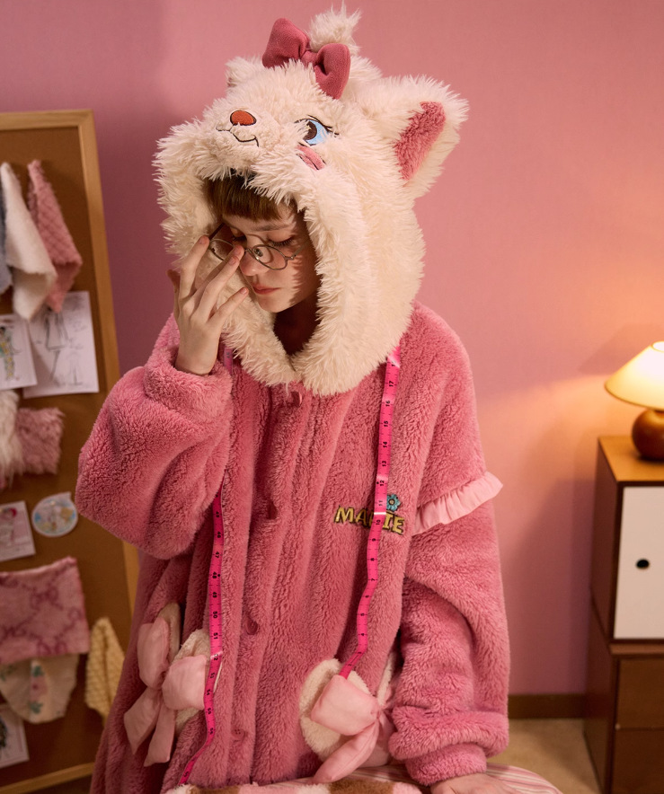 새로운 산호 양털 가을과 겨울 메리 고양이 잠옷 세트 여자의 기모 두꺼운 겉옷 가정 옷스토어 가기