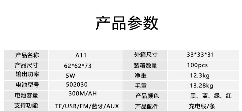支持功能:TF/USB/FM/蓝牙/AUX