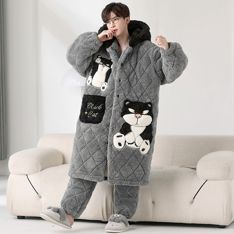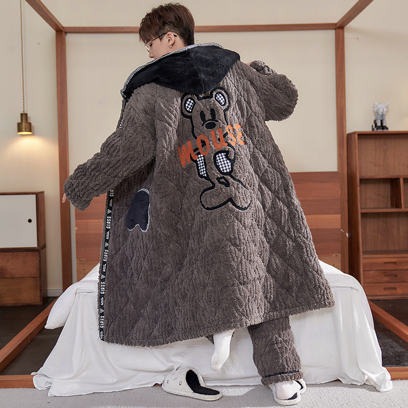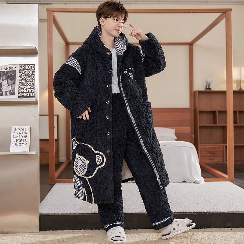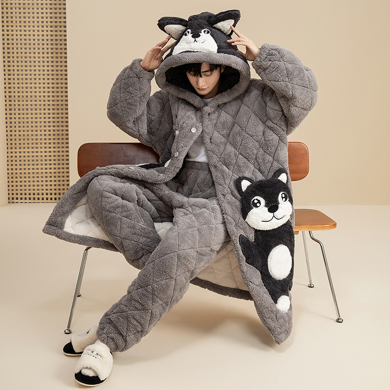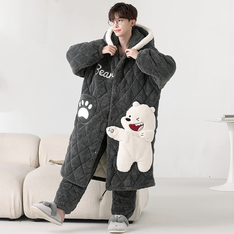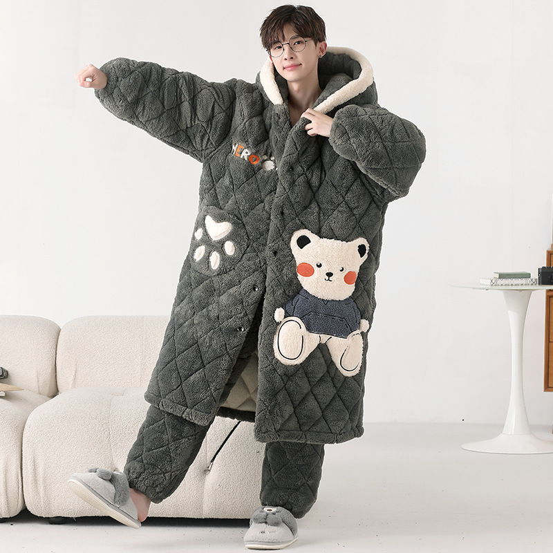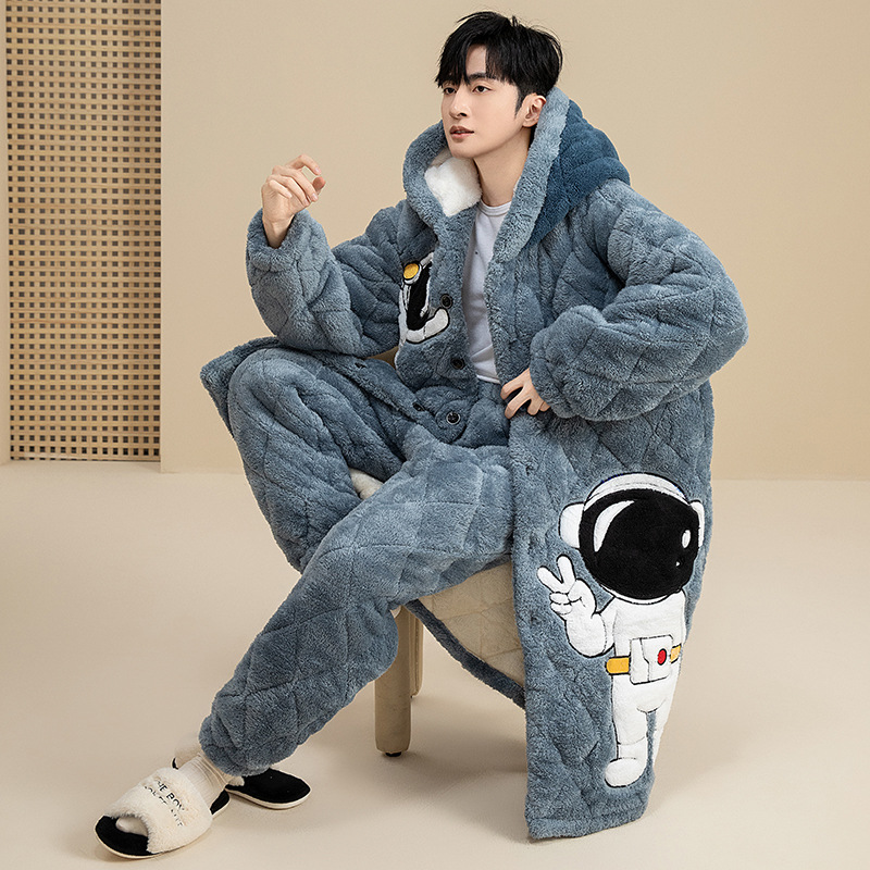 남자 잠옷 가을과 겨울 산호 양털 3 층 퀼트 기모 두꺼운 잠옷 긴 청소년 홈 세트스토어 가기