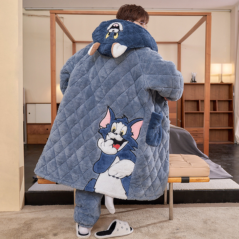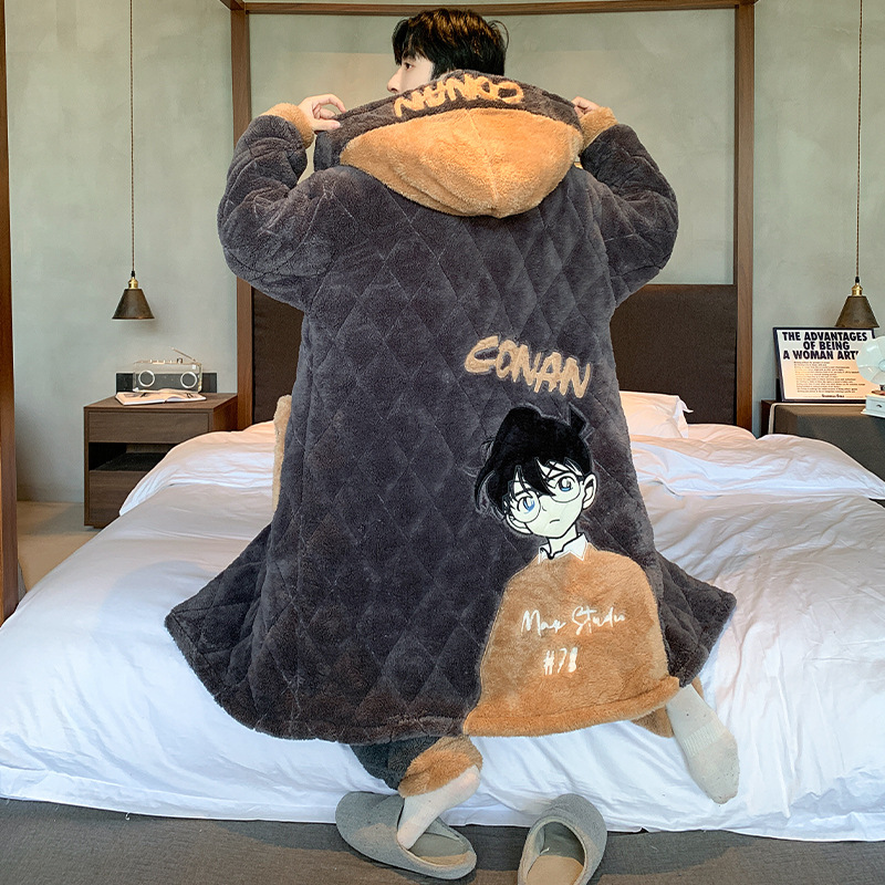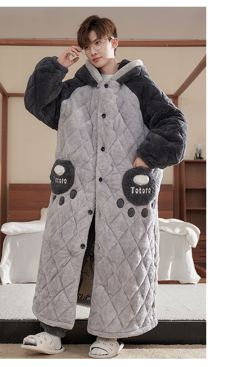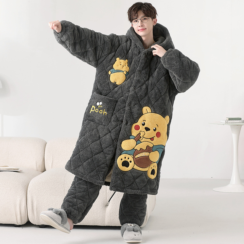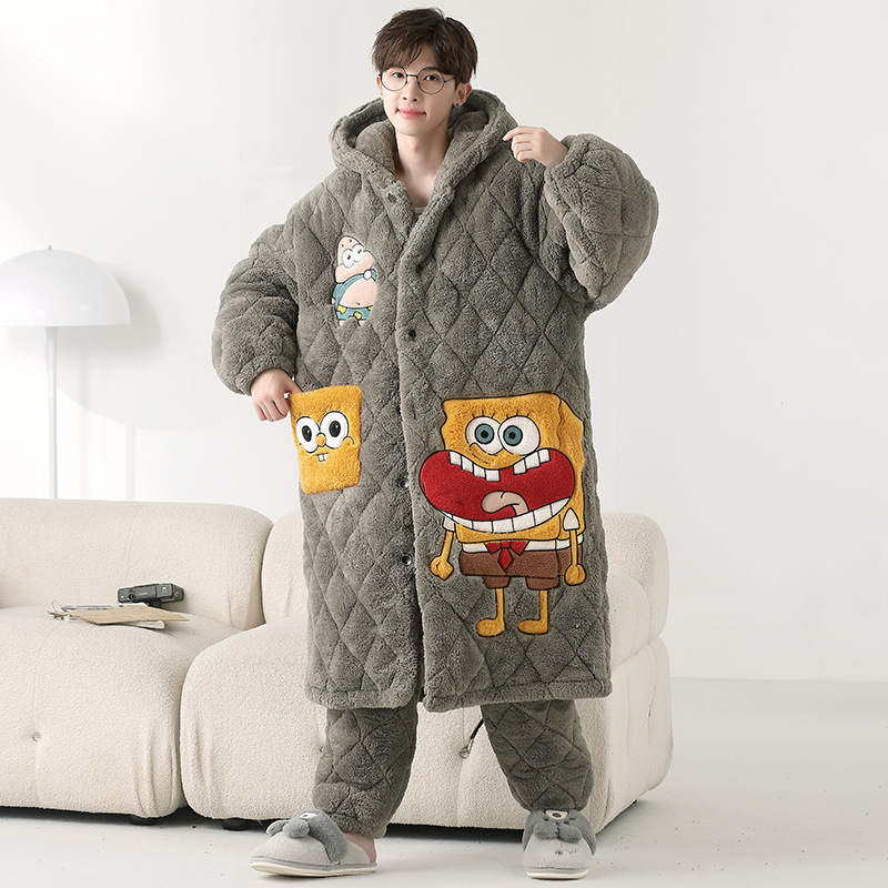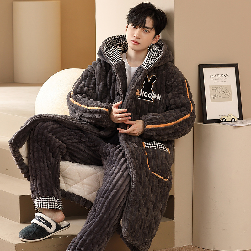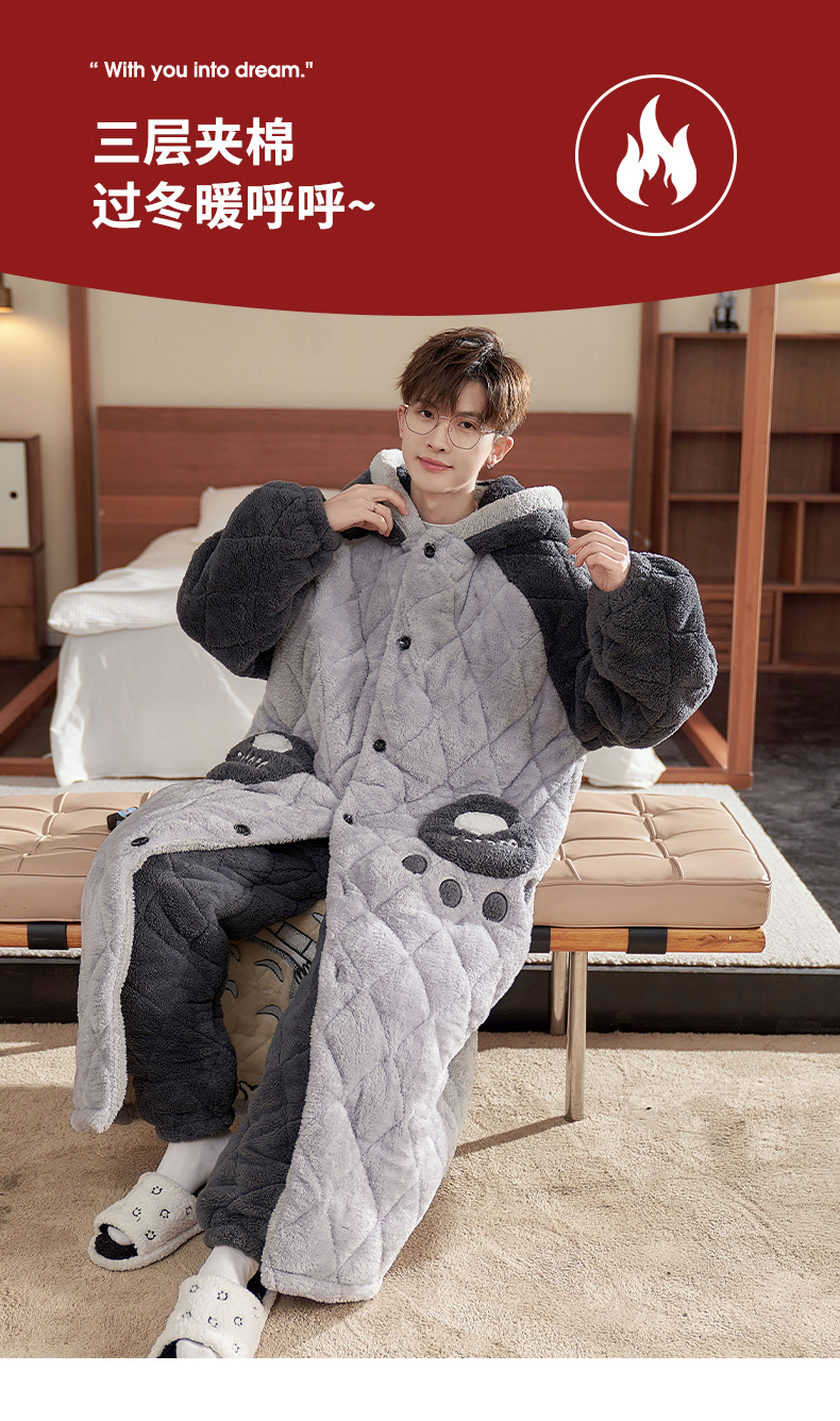 남자 잠옷 가을과 겨울 산호 양털 3 층 퀼트 기모 두꺼운 잠옷 긴 청소년 홈 세트스토어 가기