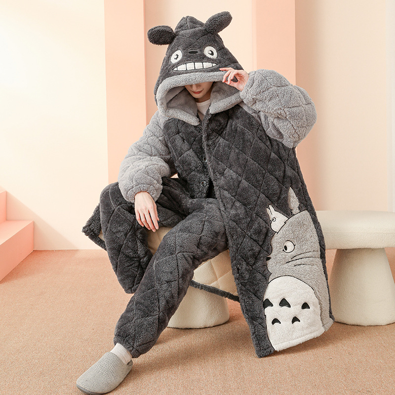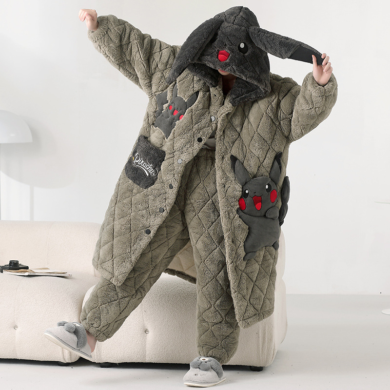 남자 잠옷 가을과 겨울 산호 양털 3 층 퀼트 기모 두꺼운 잠옷 긴 청소년 홈 세트