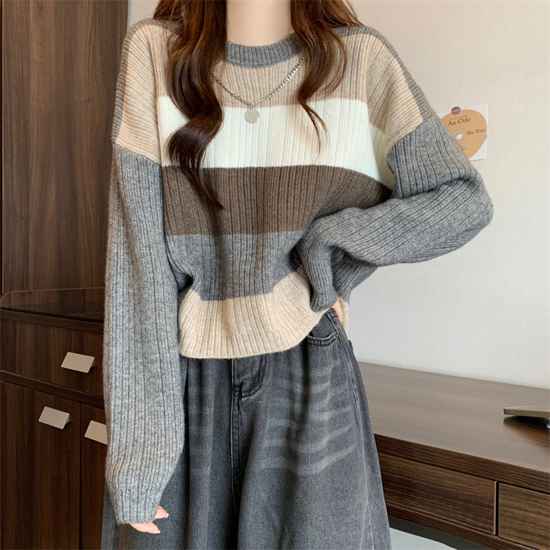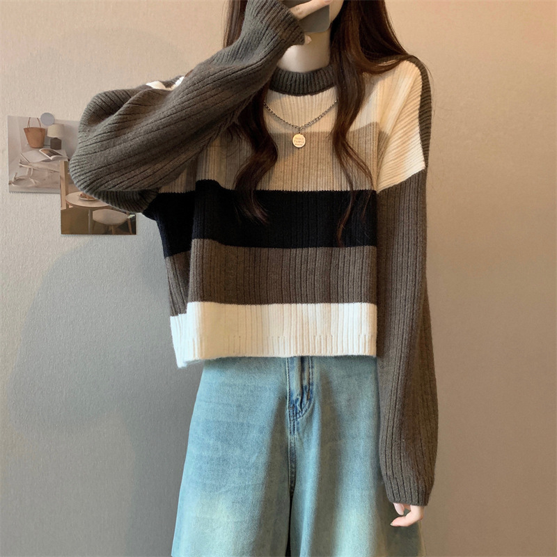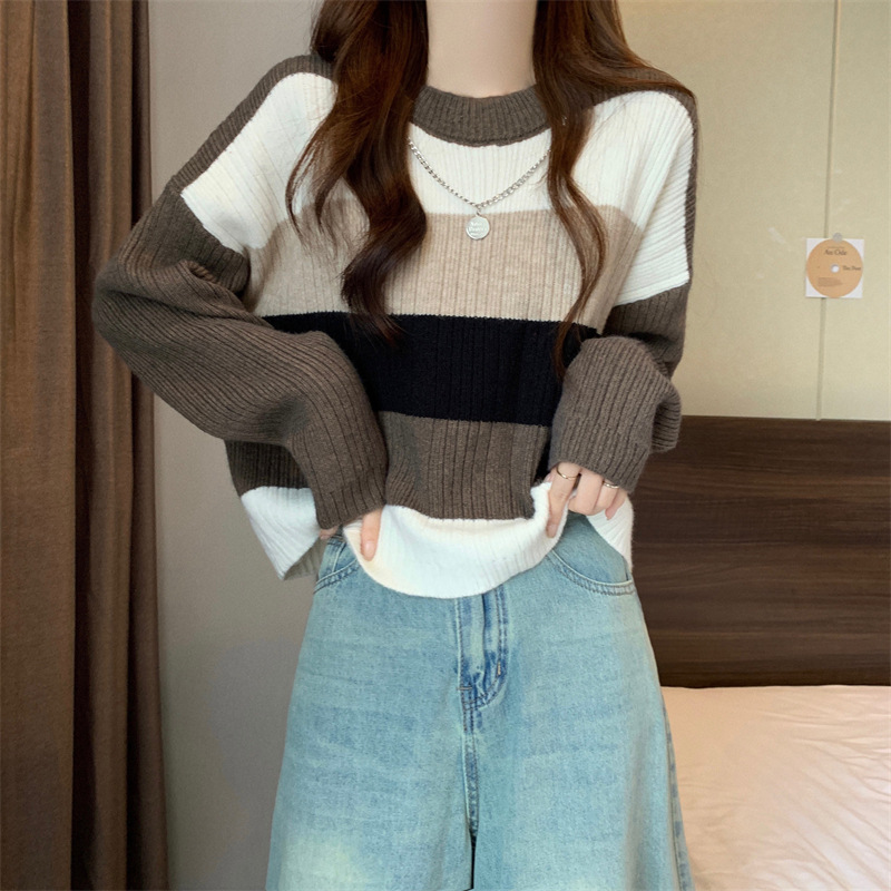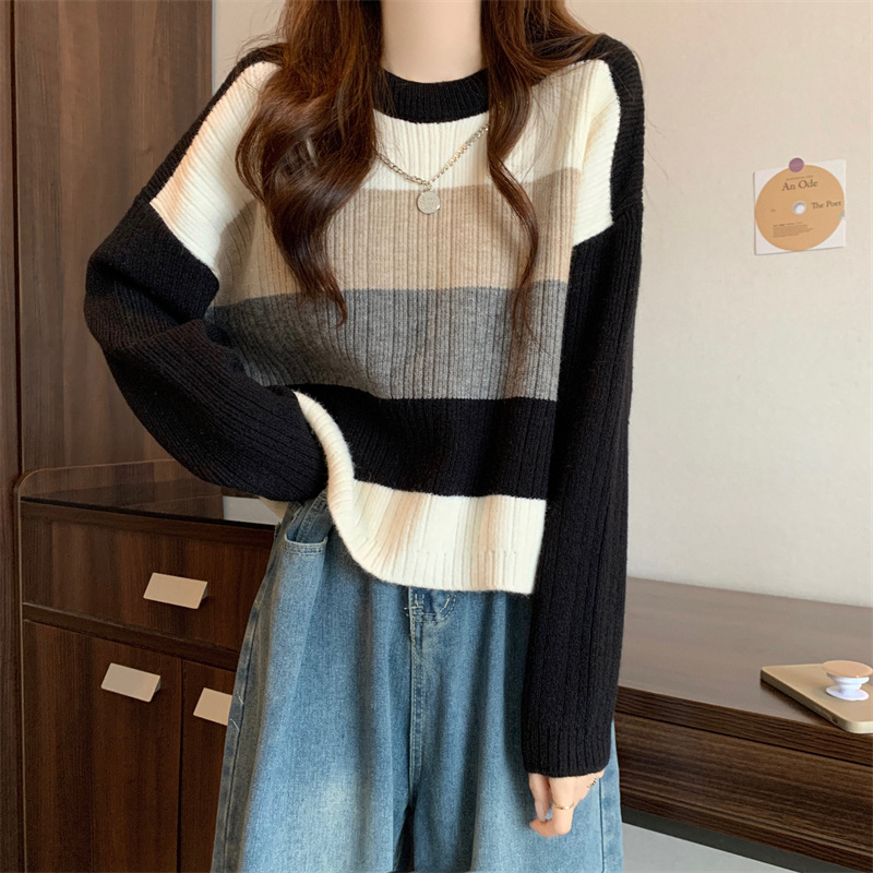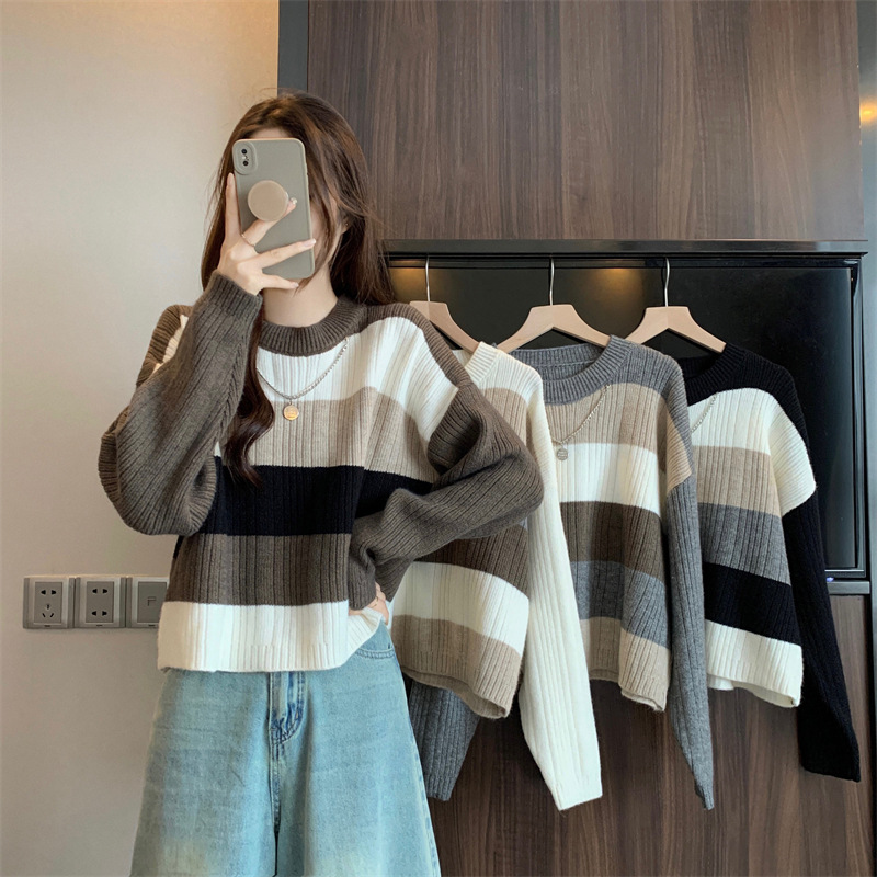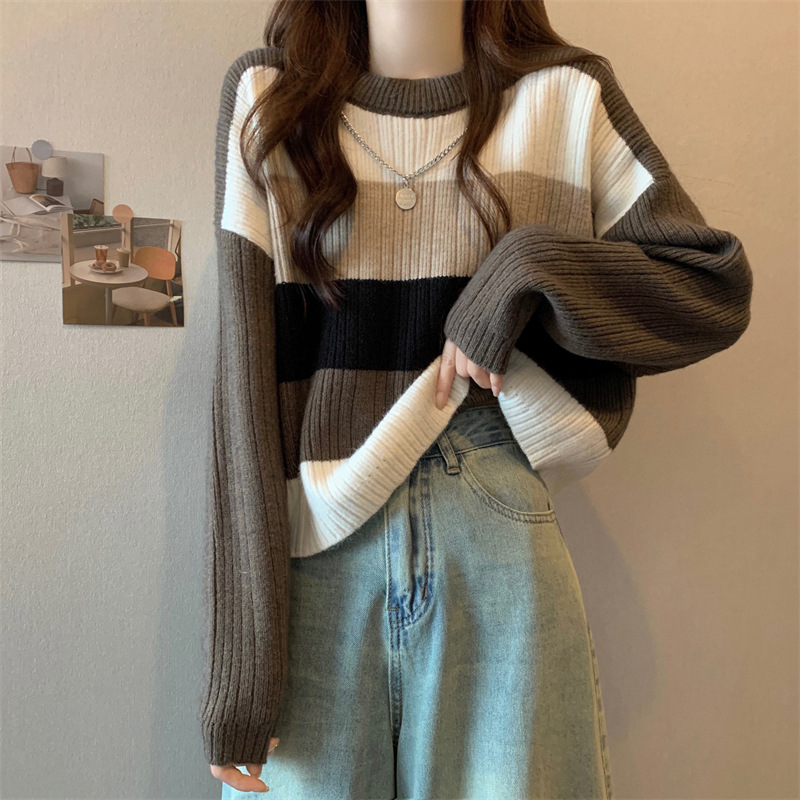 가을과 겨울 빈티지 대비 컬러 스트라이프 긴팔 니트 스웨터 여성용 한국식 느긋한 부드러운 왁스 풀오버 짧은 느슨한 따뜻한 탑스토어 가기