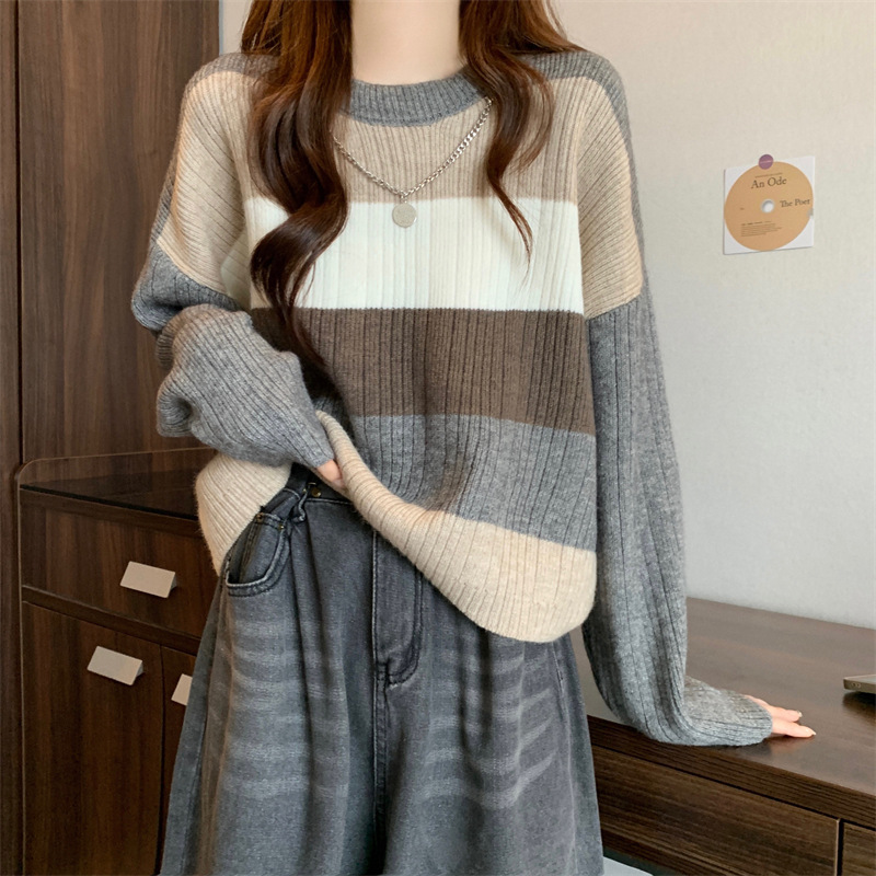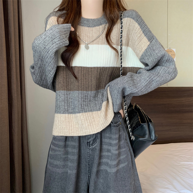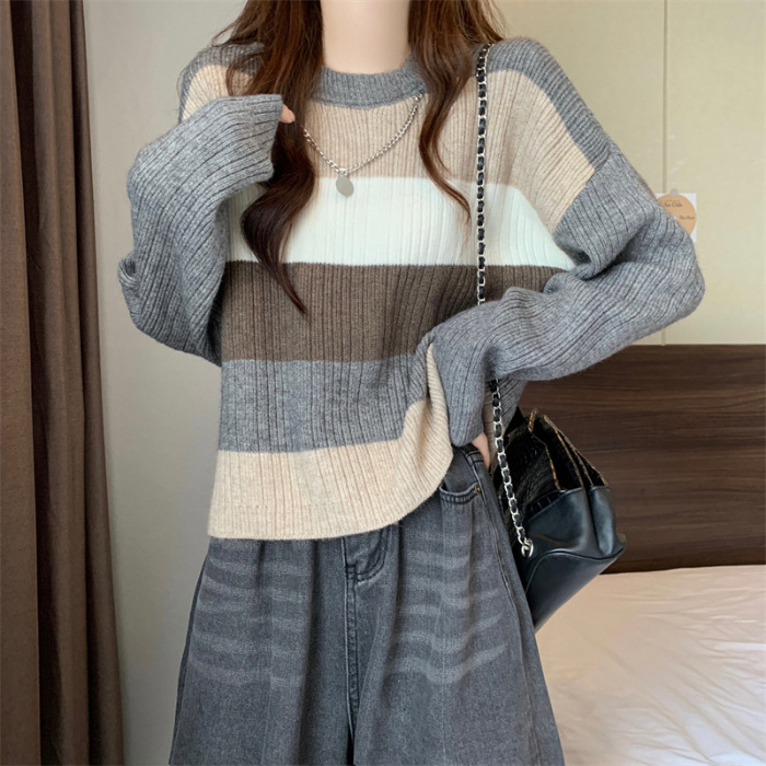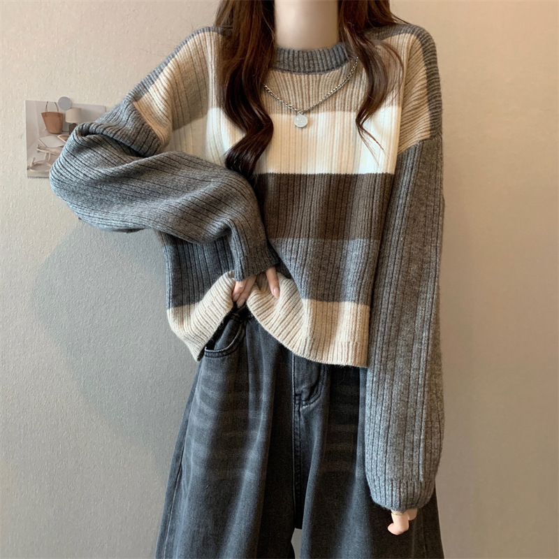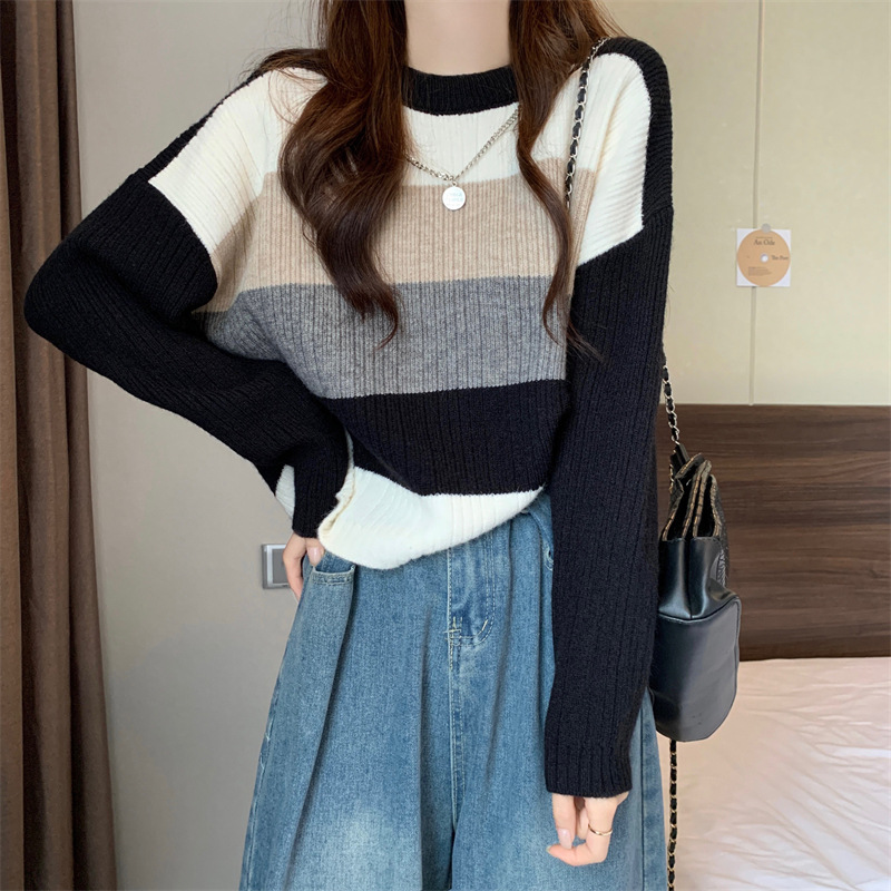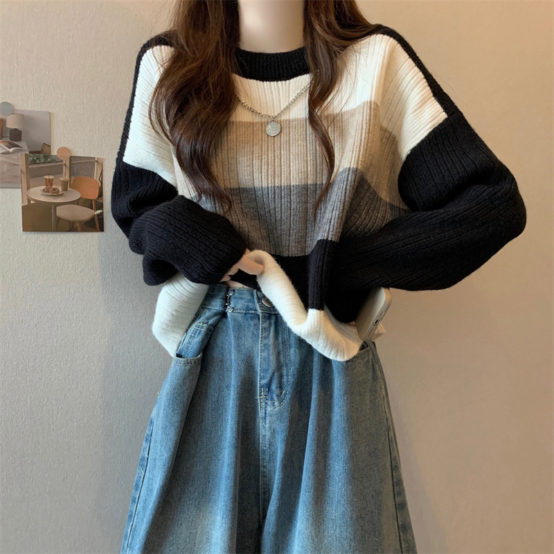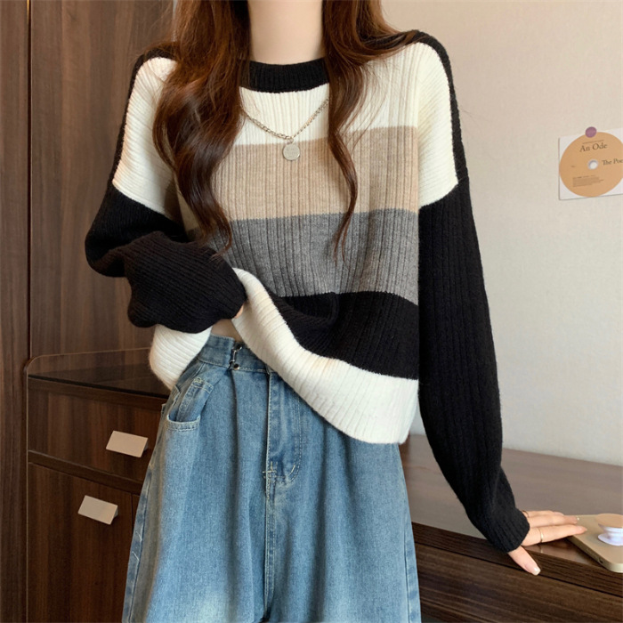 가을과 겨울 빈티지 대비 컬러 스트라이프 긴팔 니트 스웨터 여성용 한국식 느긋한 부드러운 왁스 풀오버 짧은 느슨한 따뜻한 탑스토어 가기