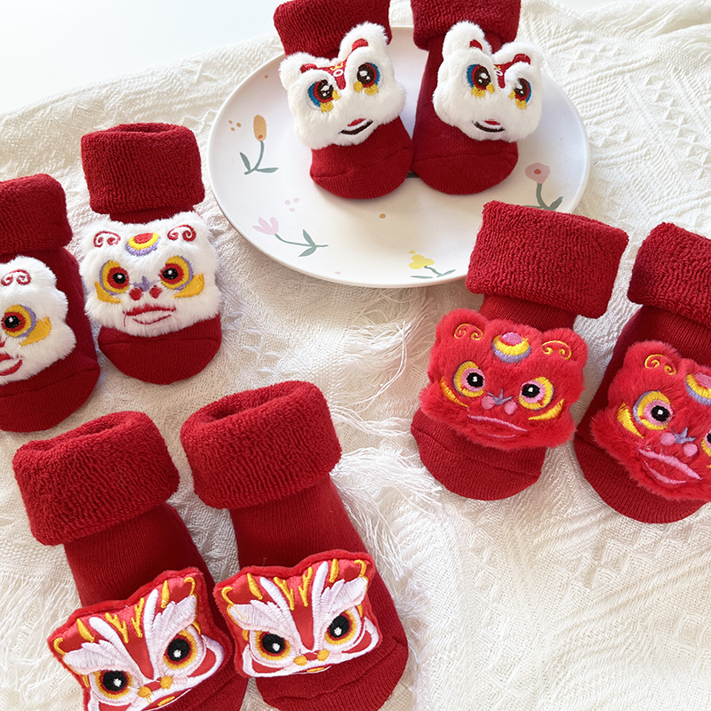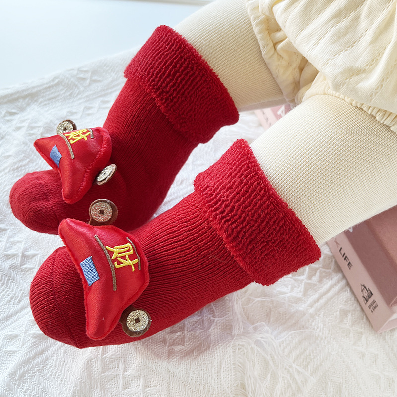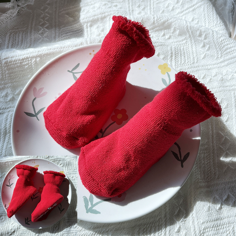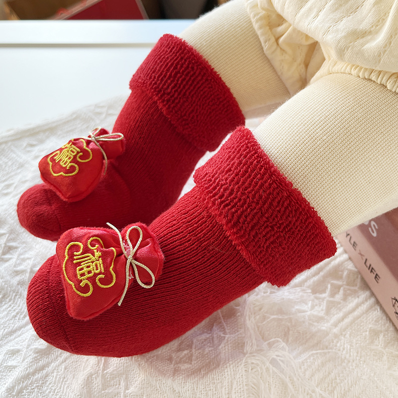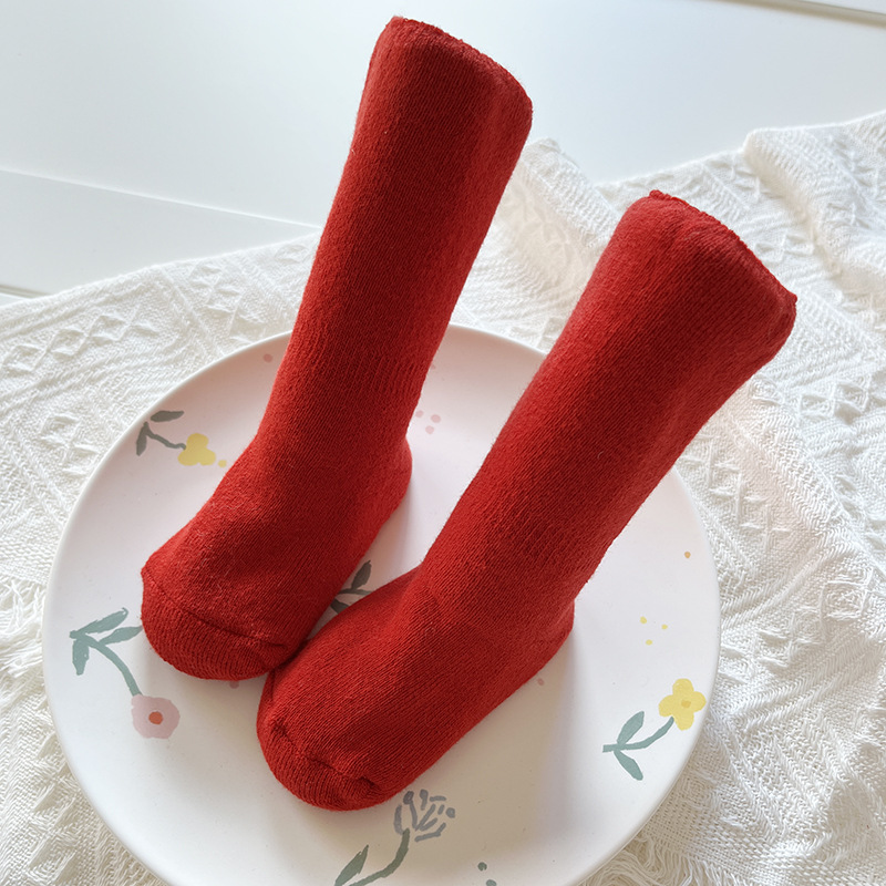 신생아 아기 테리 양말 가을과 겨울 두꺼운 기모 미끄럼 방지 유아 양말 100 일 오래 된 새해 빨간 양말
