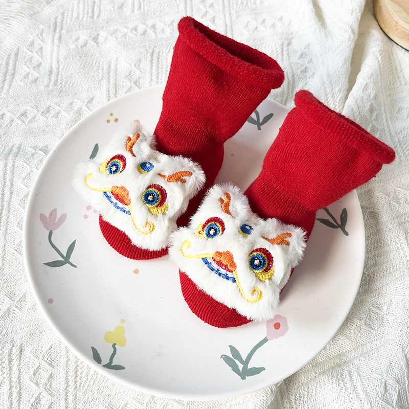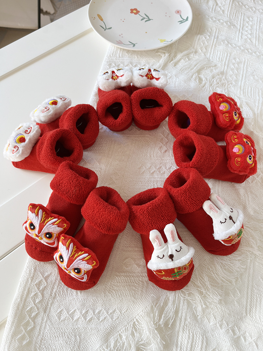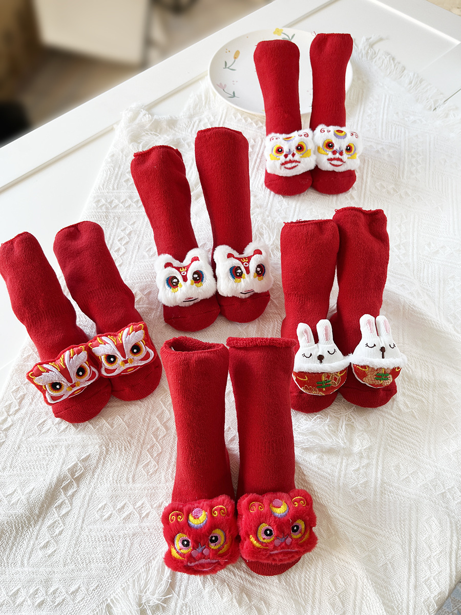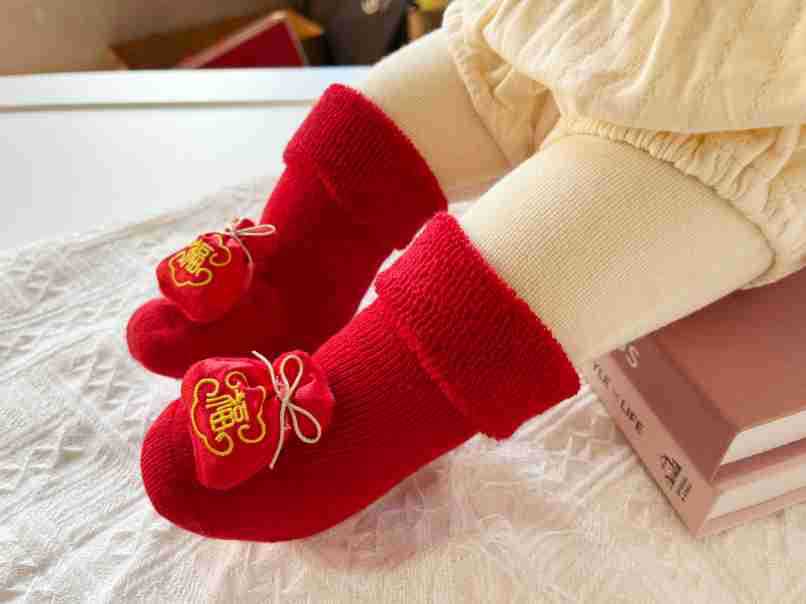 신생아 아기 테리 양말 가을과 겨울 두꺼운 기모 미끄럼 방지 유아 양말 100 일 오래 된 새해 빨간 양말