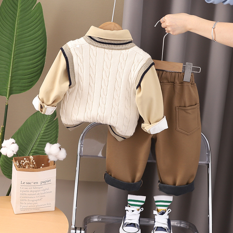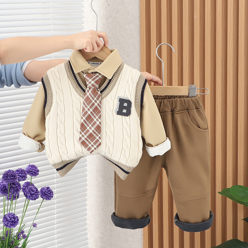 어린 소년의 대학 스타일 넥타이 겨울 2023 가을과 겨울 새로운 어린이 기모 스웨터 조끼 3 피스 어린이 세트