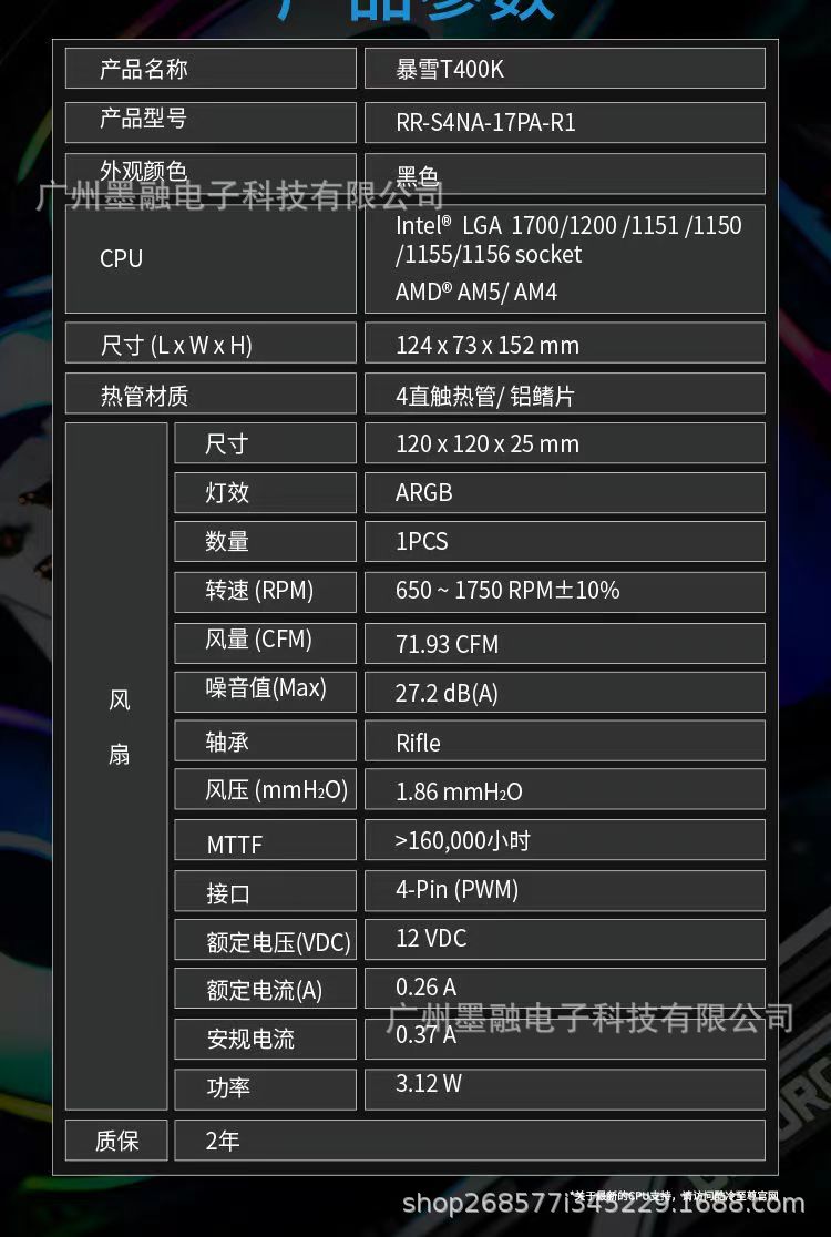 쿨 익스트림 블리자드 T400K 라디에이터 니켈 도금 4 구리 튜브 PWM 속도 제어 ARGB 램프 효과 CPU 팬
