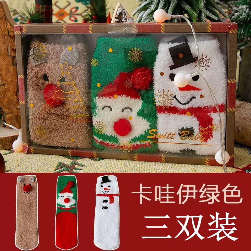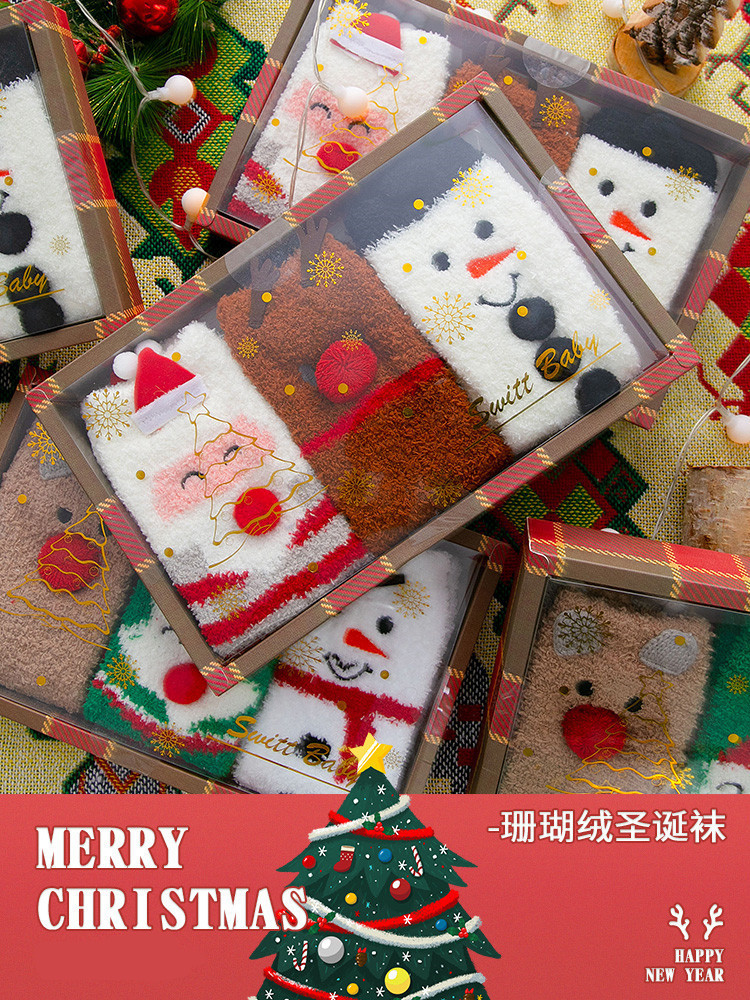 크리스마스 산호 벨벳 양말 여자의 가을과 겨울 가정 기모 두꺼운 바닥 새해 선물 상자 수면 양말