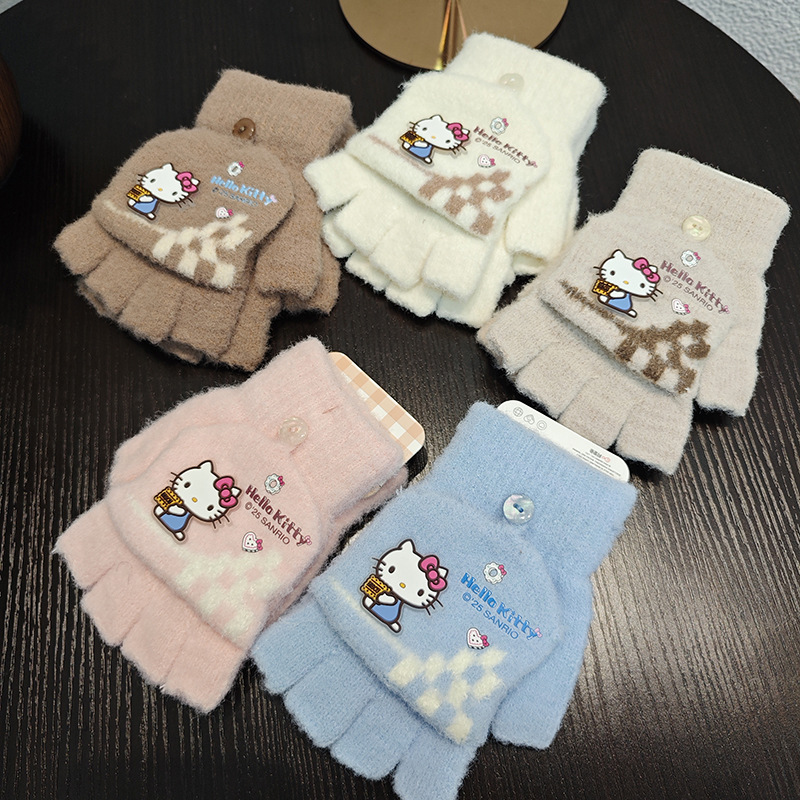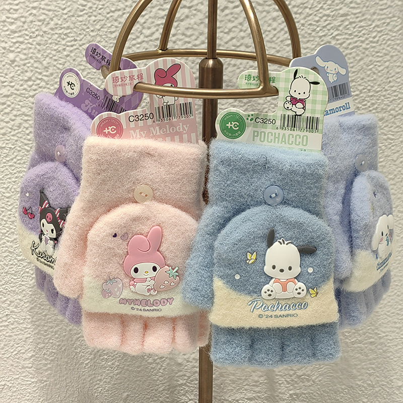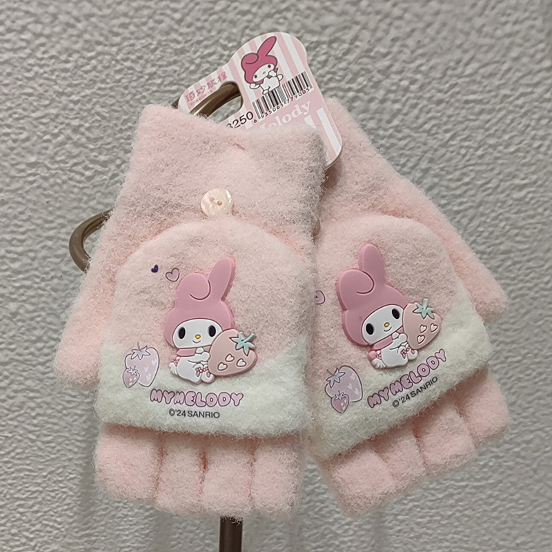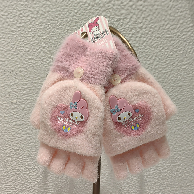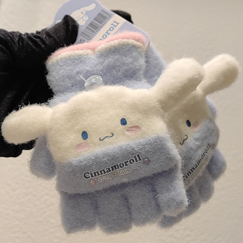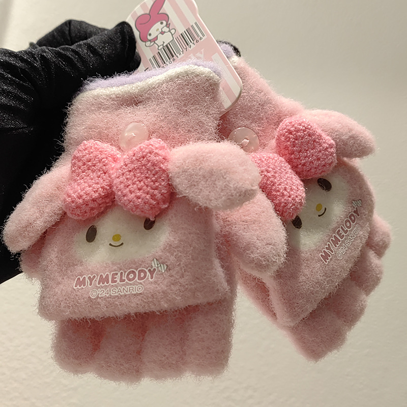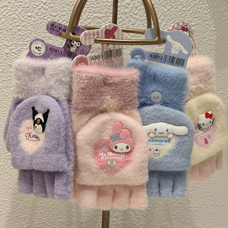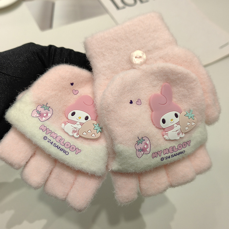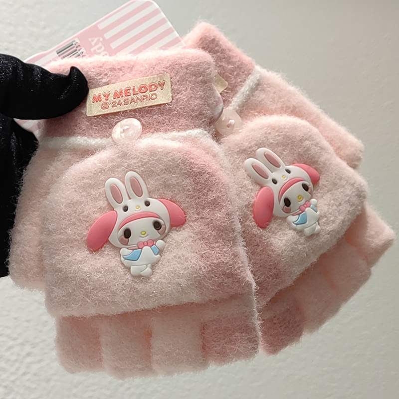 Sanrio 정품 공인 어린이 장갑 소녀를위한 겨울 반 손가락 플립 장갑 만화 초등 학생 쓰기 장갑