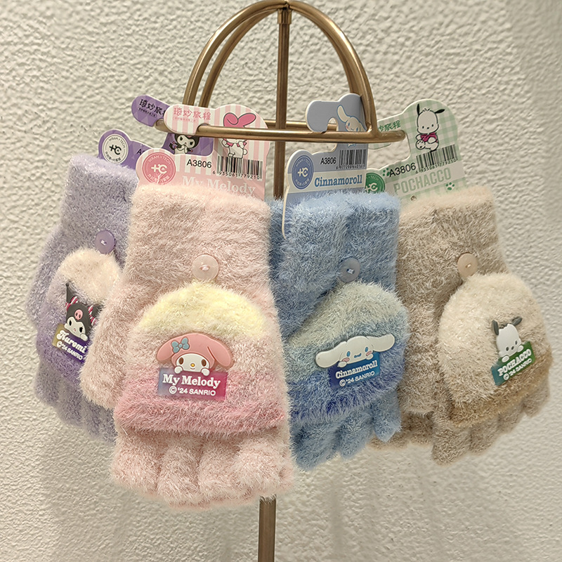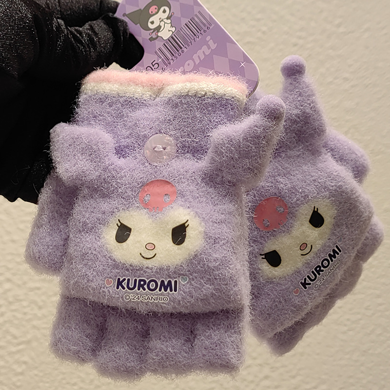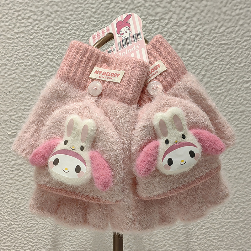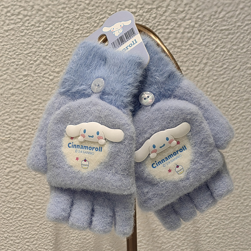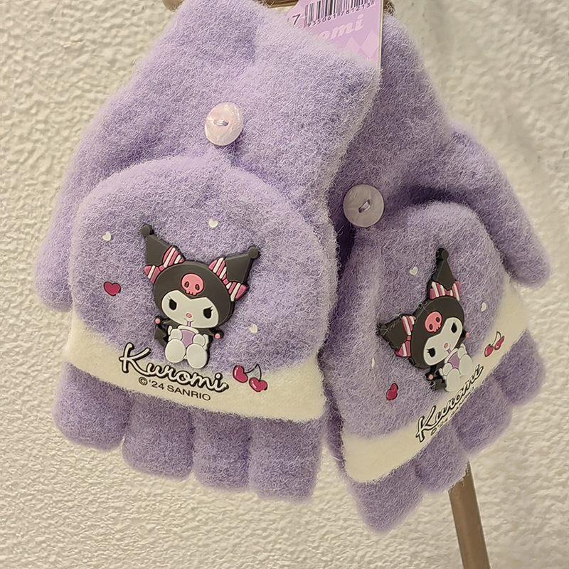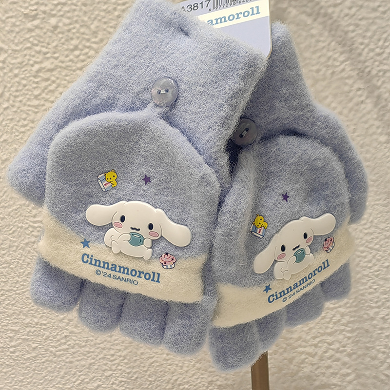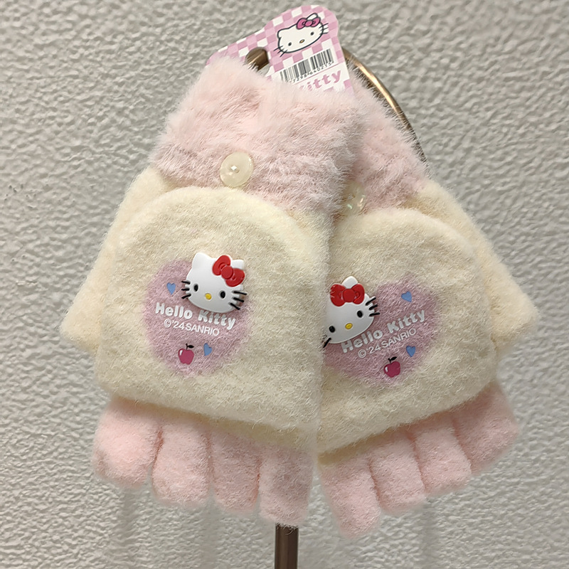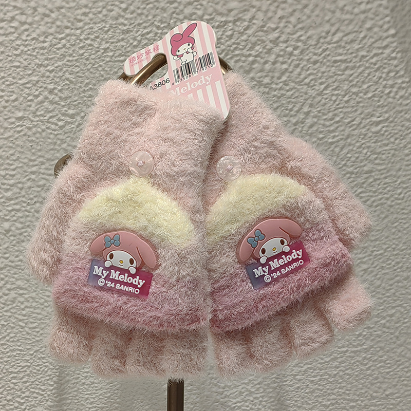 Sanrio 정품 공인 어린이 장갑 소녀를위한 겨울 반 손가락 플립 장갑 만화 초등 학생 쓰기 장갑