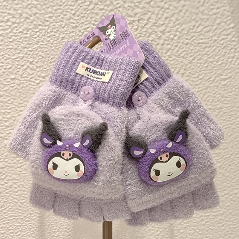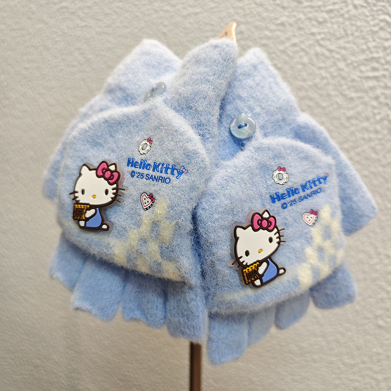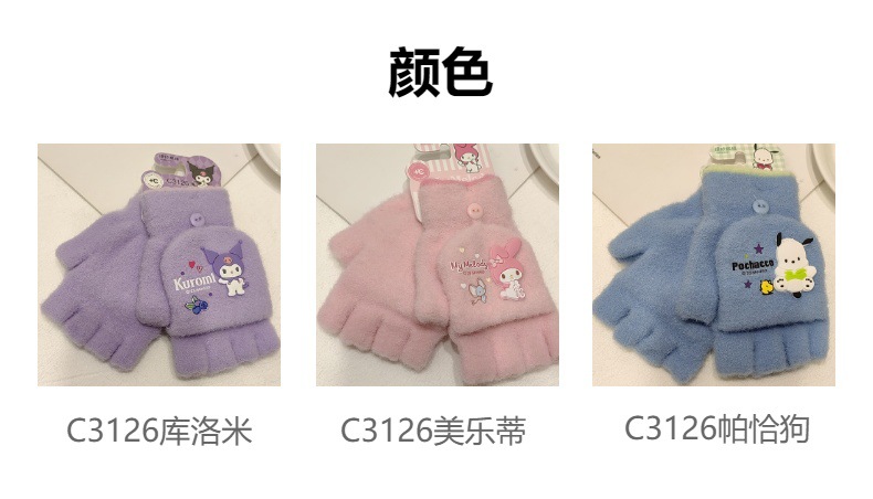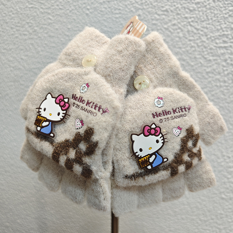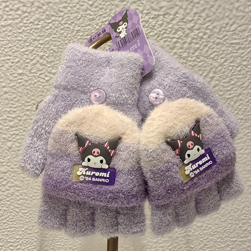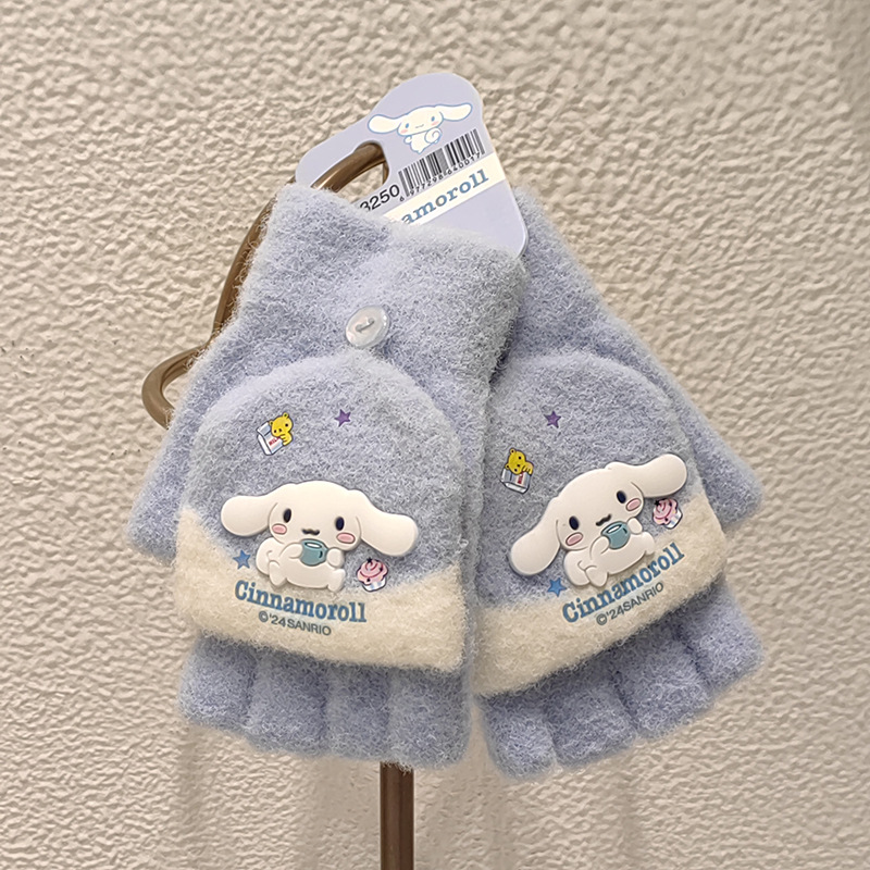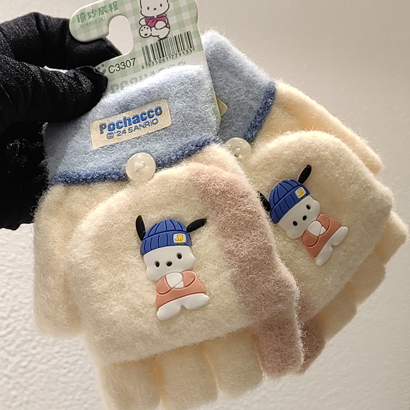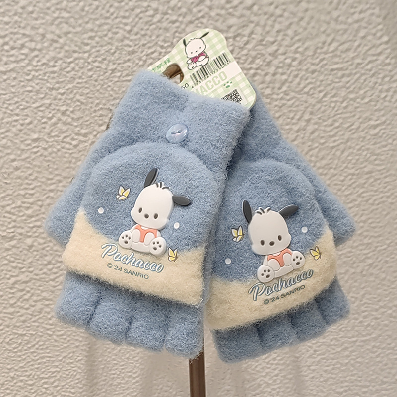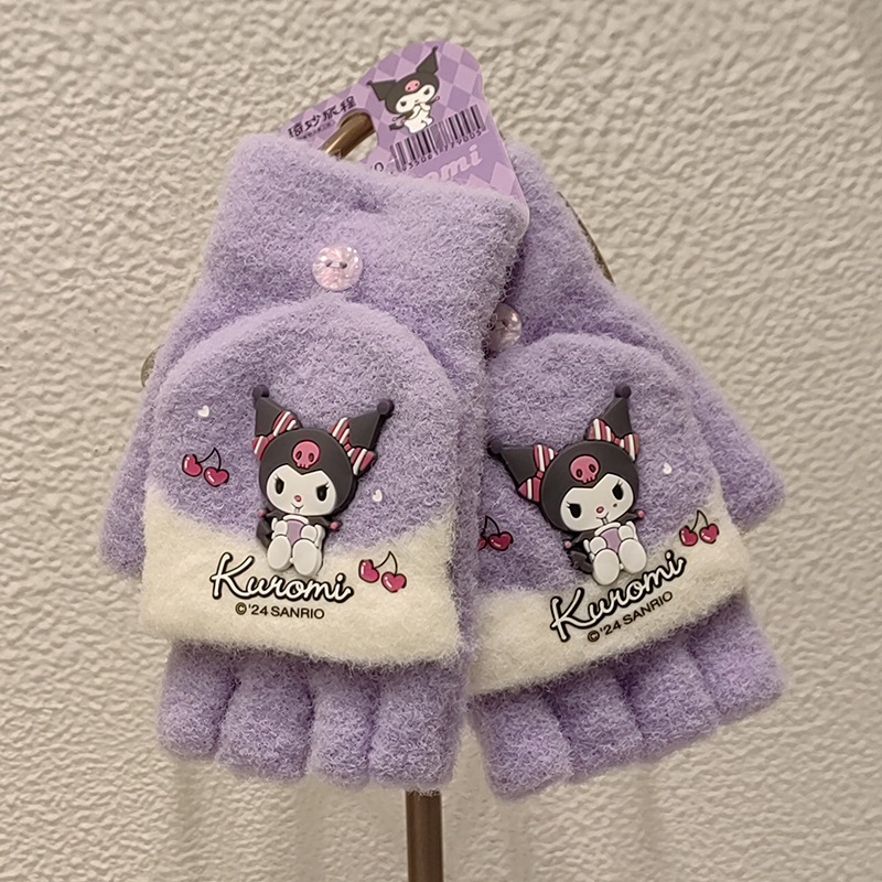 Sanrio 정품 공인 어린이 장갑 소녀를위한 겨울 반 손가락 플립 장갑 만화 초등 학생 쓰기 장갑