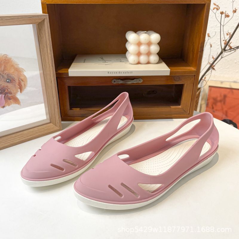 2023 새로운 샌들 여성용 여름 경량 유행 캐주얼 구멍 신발 여성용 플랫 커버 발 사출 몰딩 중공 비치 신발 비