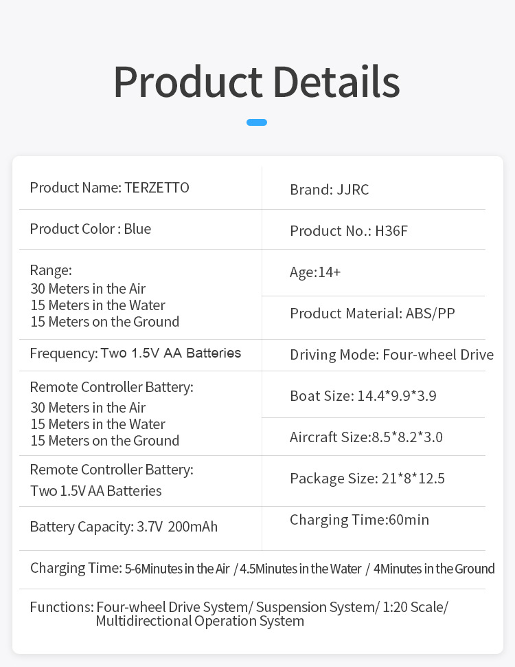 配件:飞行器*1、遥控器*1、USB线*1、船体*1 英文说明书*1