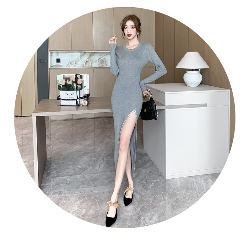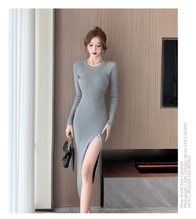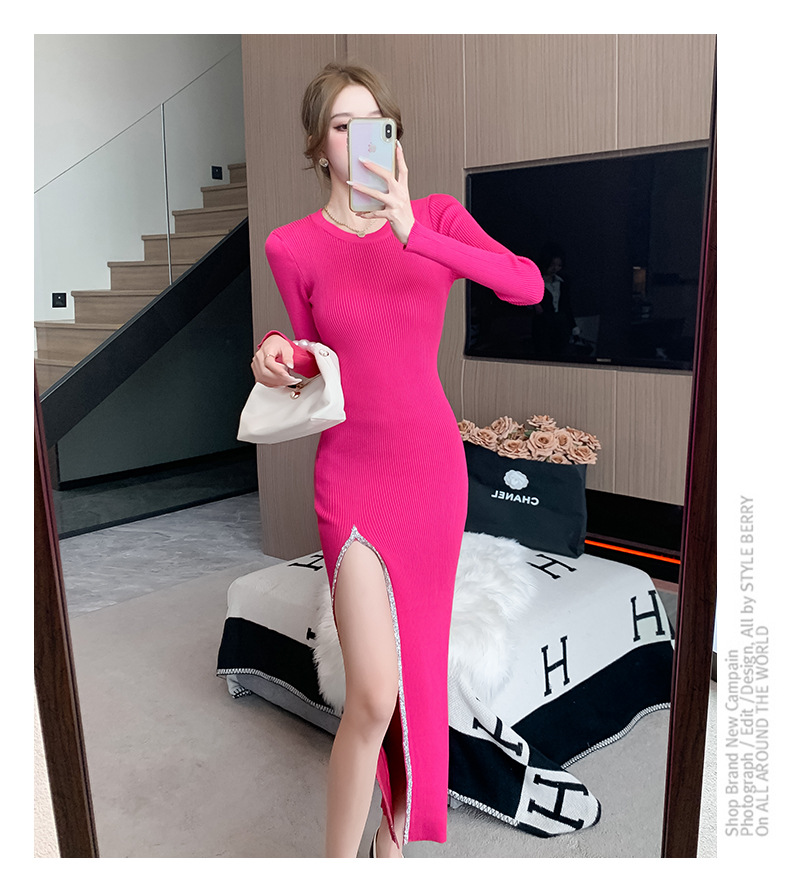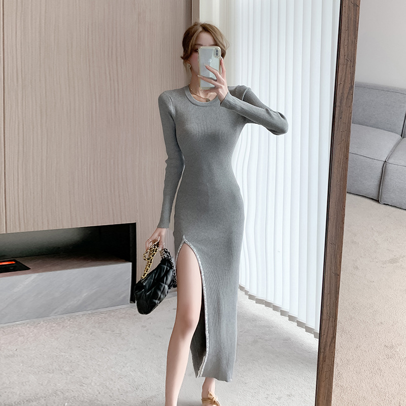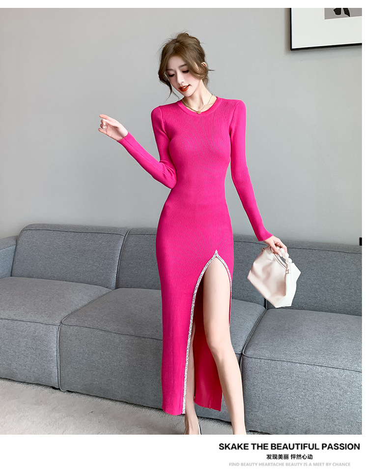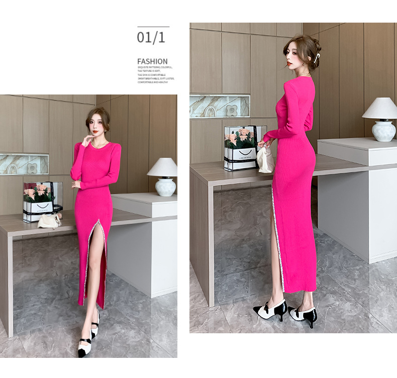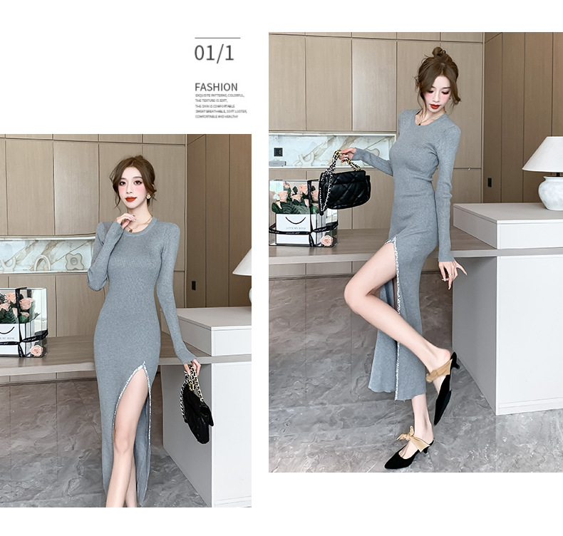 우아한 분할 핫 드릴링 탄성 니트 원피스 꽉 허리 슬리밍 틈새 디자인 스커트스토어 가기