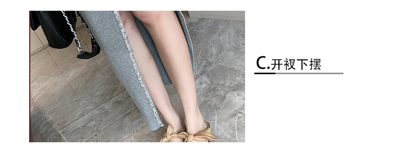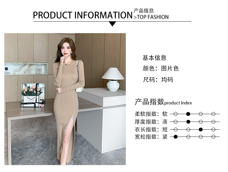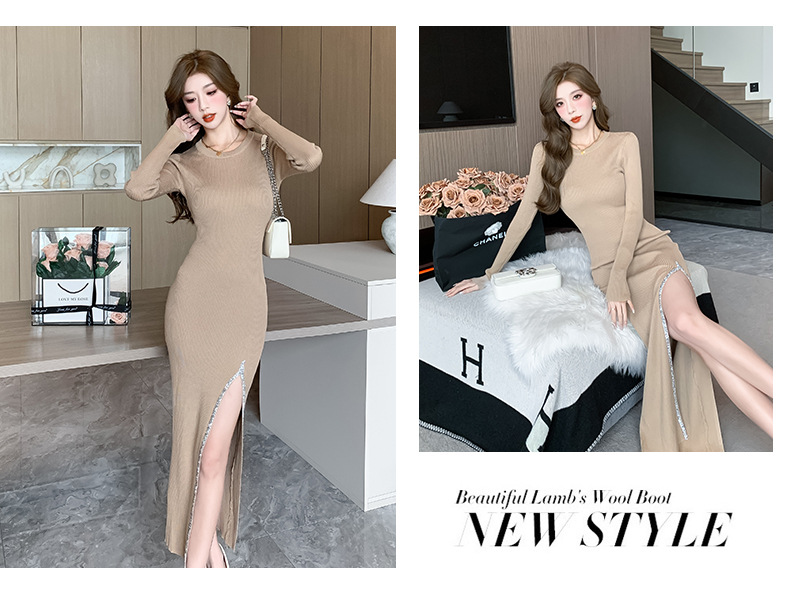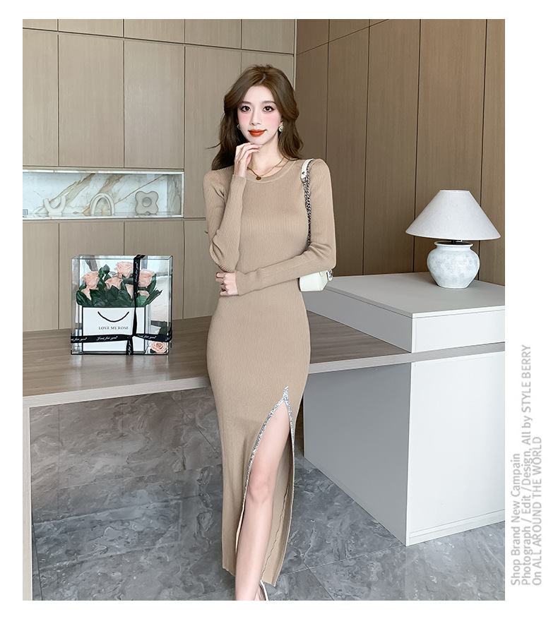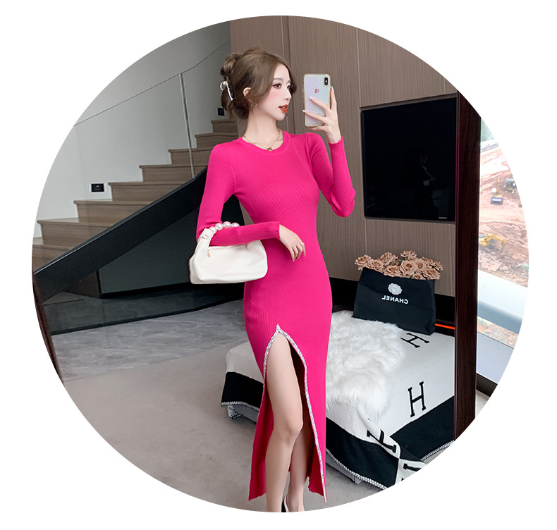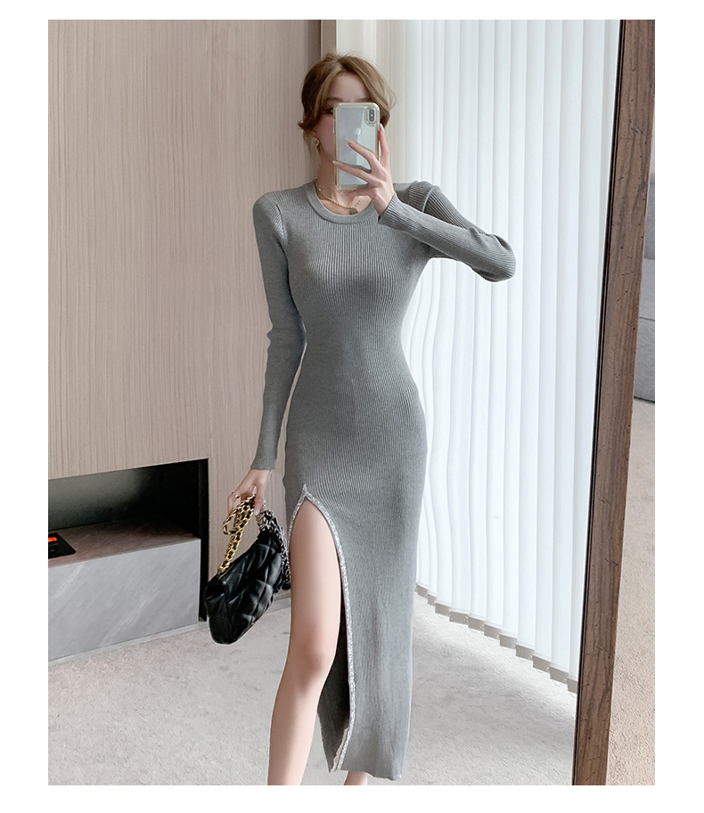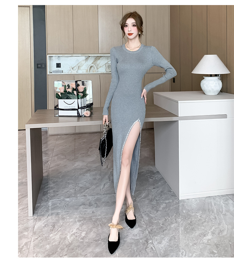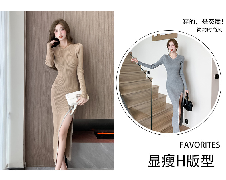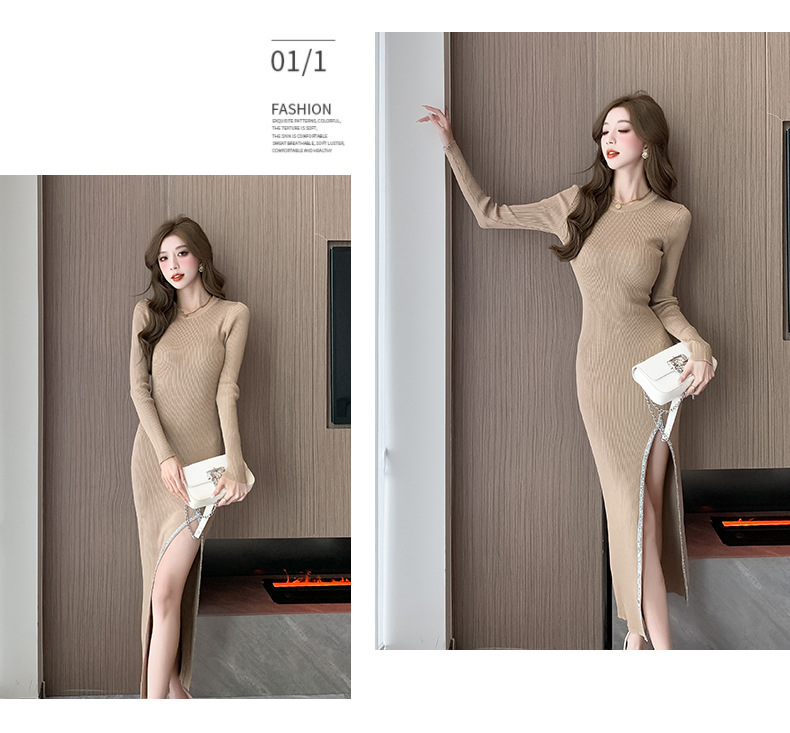 우아한 분할 핫 드릴링 탄성 니트 원피스 꽉 허리 슬리밍 틈새 디자인 스커트스토어 가기