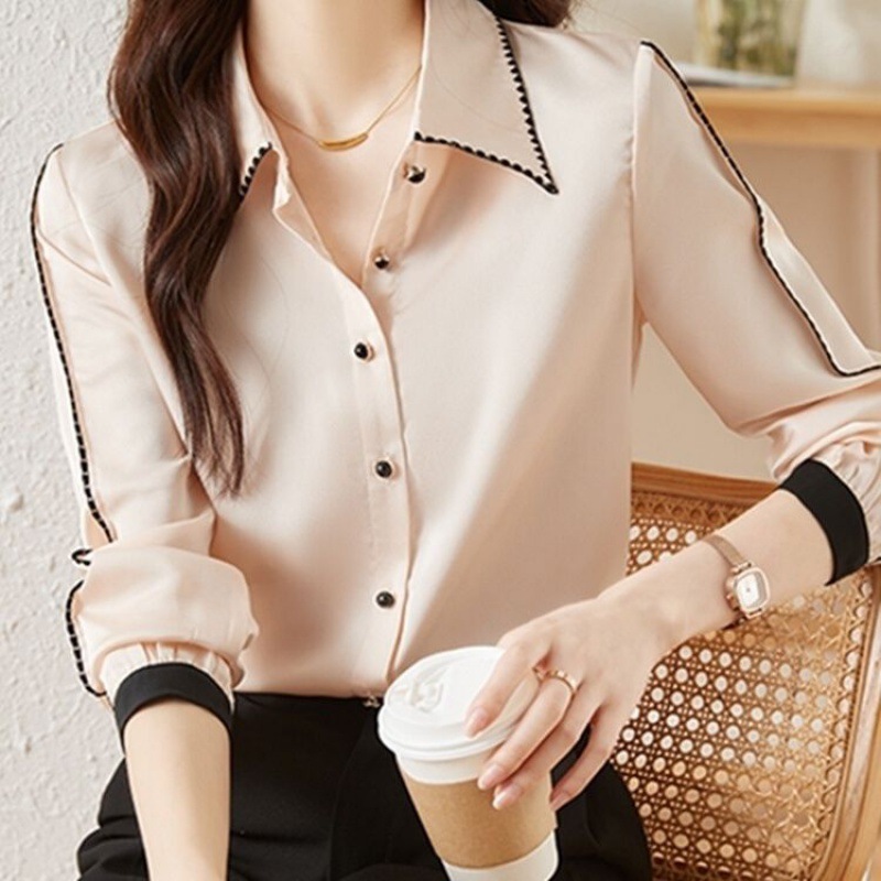 가벼운 럭셔리 하이 엔드 새틴 셔츠 여자 2023 봄 새로운 한국 스타일 유행 우아한 통근 전문 옷깃 셔츠스토어 가기