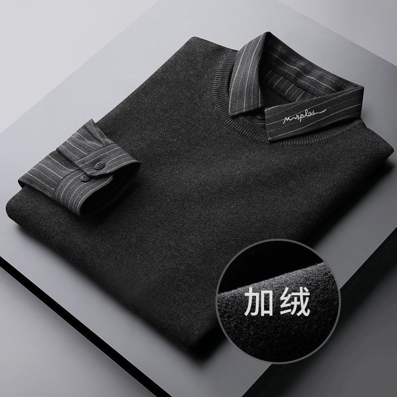 2023 가을과 겨울 자수 셔츠 칼라 스웨터 남자의 가짜 투피스 기모 두꺼운 캐주얼 스트라이프 셔츠 가짜 칼라