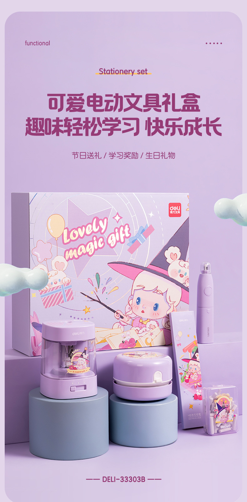 델리 33303B 전기 문구 세트 초등 학생 학용품 오프닝 시즌 할로윈 생일 서프라이즈 선물