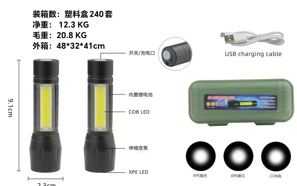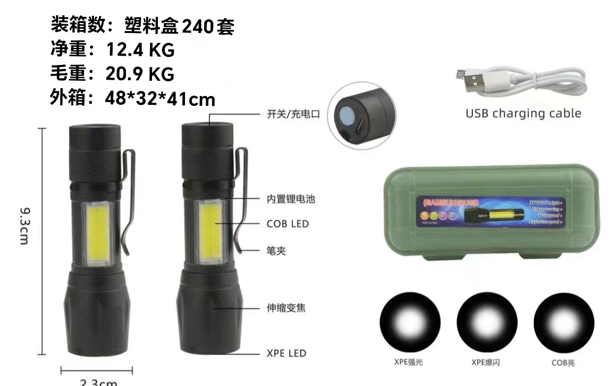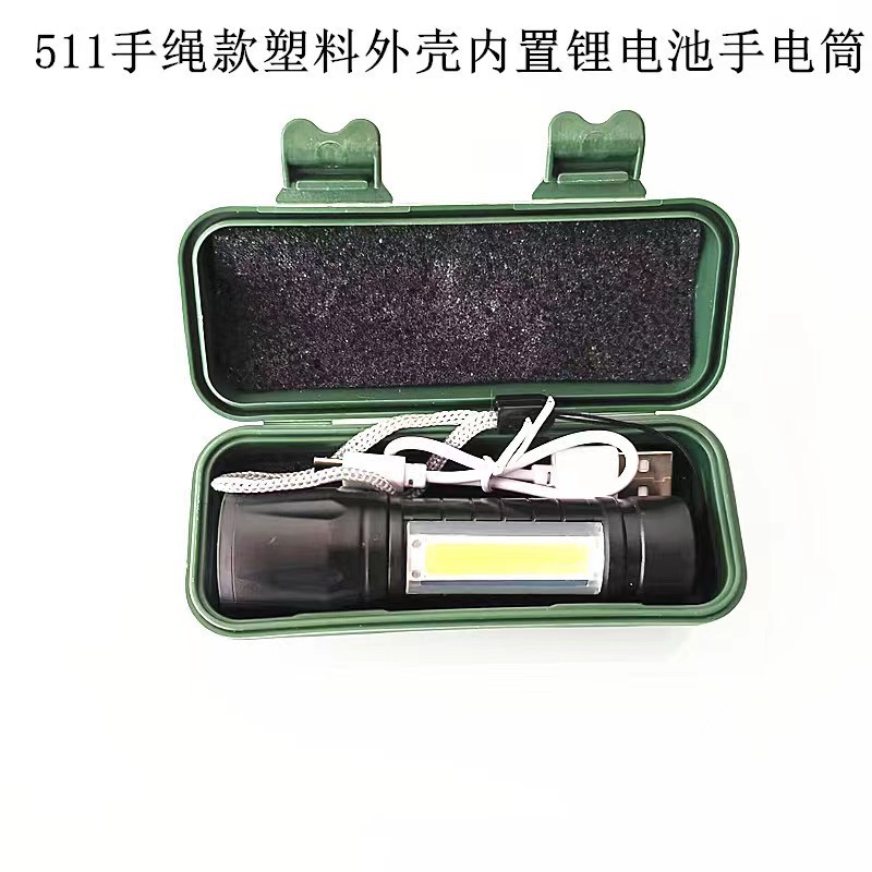 • 511s 테일 로프 플라스틱 손전등 + USB 라인 + 녹색 플라스틱 선물 상자